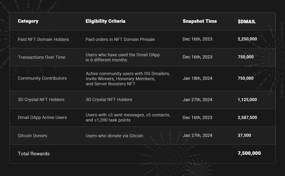 • Dmail DApp Active Users – юзери, які мають від 3 повідомлень, 5 контактів і від 1200 поінтів