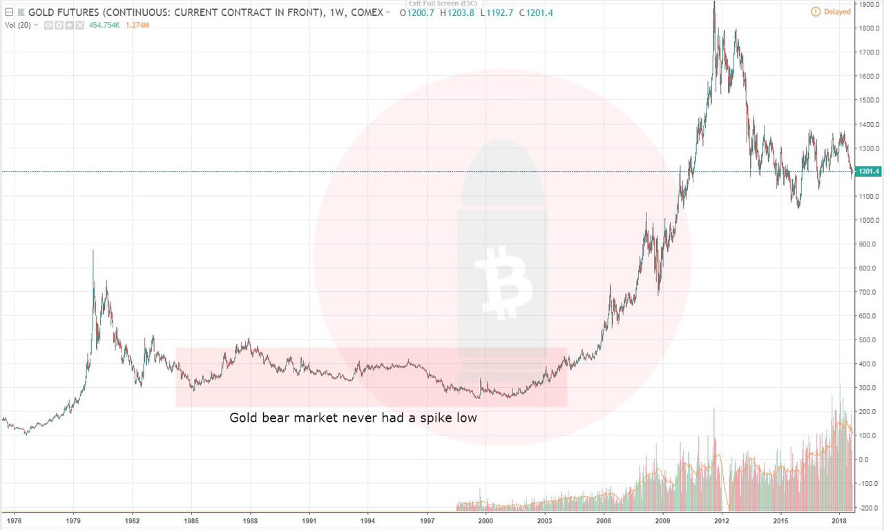 βNotice how the 26-year gold bear market never had a spike low. It was slow bleed and then it just got stuck at the bottom.