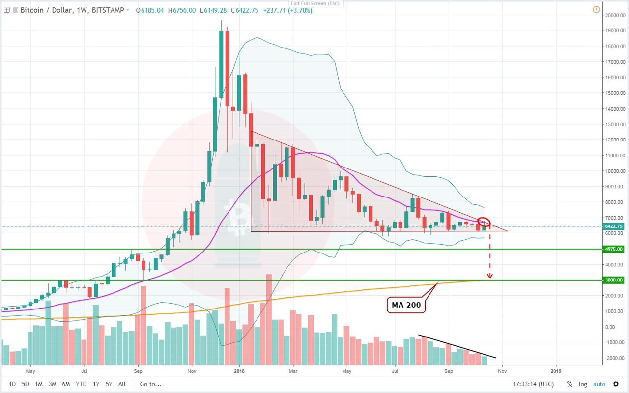 ๐From a technical perspective nothing has really changed on fiat US dollar exchanges. We are still within the triangle, we did not even hit the 30-week MA. Got rejected by the top of the triangle & middle of Bollinger Bands. There always was a probability of going to the top of the triangle (~7k). The bearish picture is not invalidated.