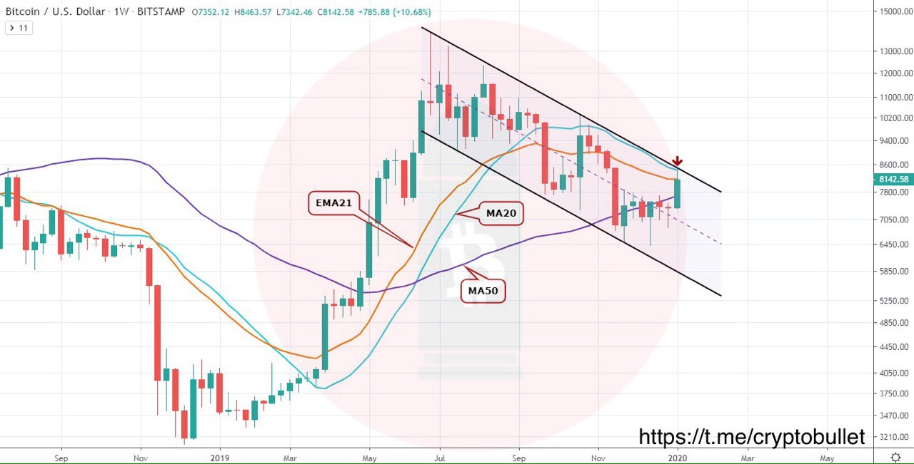 Last week closed pretty bullish, because we managed to close above the downward channel resistance, MA20 & EMA21. Right now this cluster can act as a support and going below it would be dangerous for the bulls.