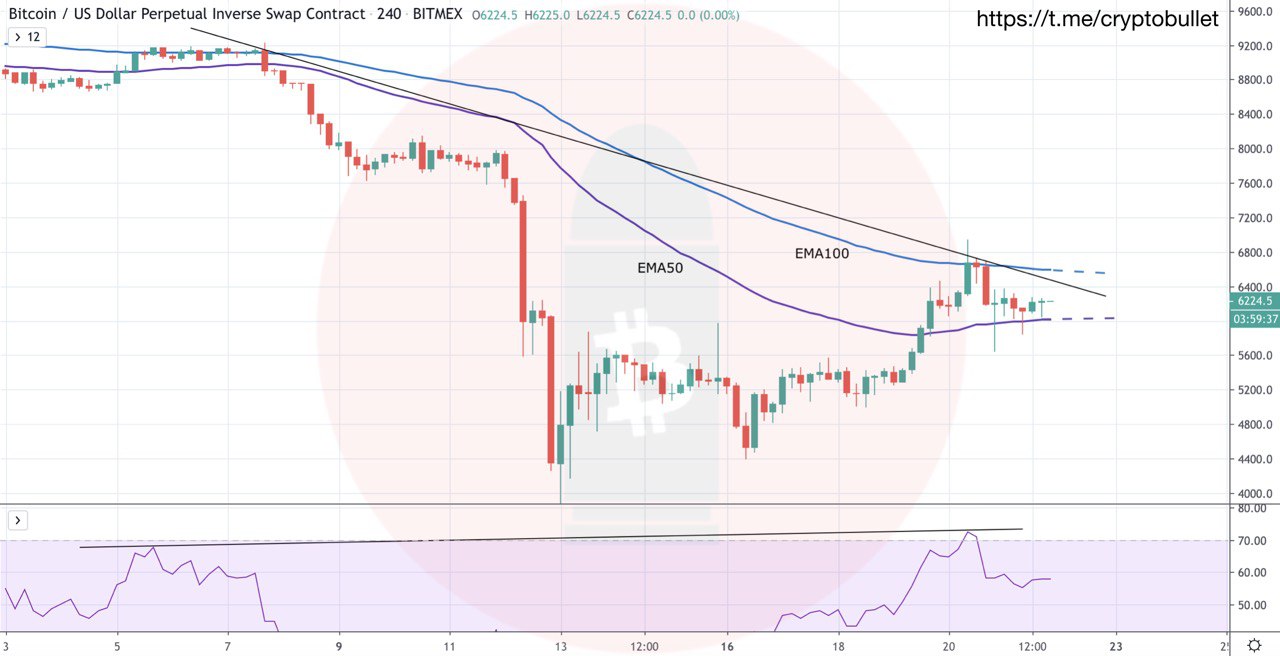BTC 4h update RSI got rejected by the declining trendline once again We returned back below the MA50 and EMA100 and nearing the next support zone - mid line of the channel. If it doesn’t hold, next stops would be 5900 and low 5ks (the bottom of the channel)