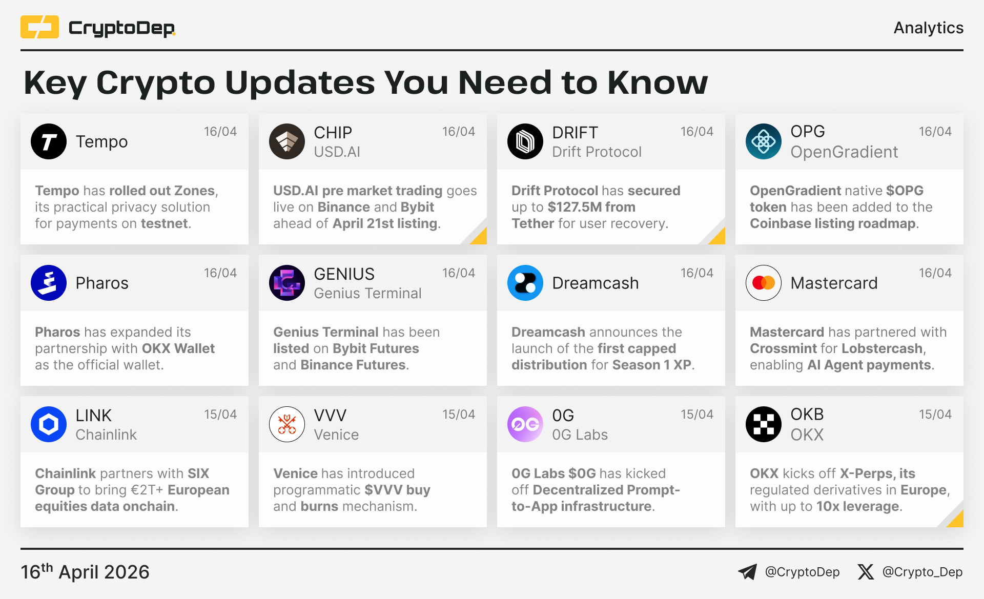 OpenGradient and Wingbits are nearing TGEs on April 21st and April 22nd, while Pharos, Fluent, USD AI, and INK are preparing token launches across this spring.