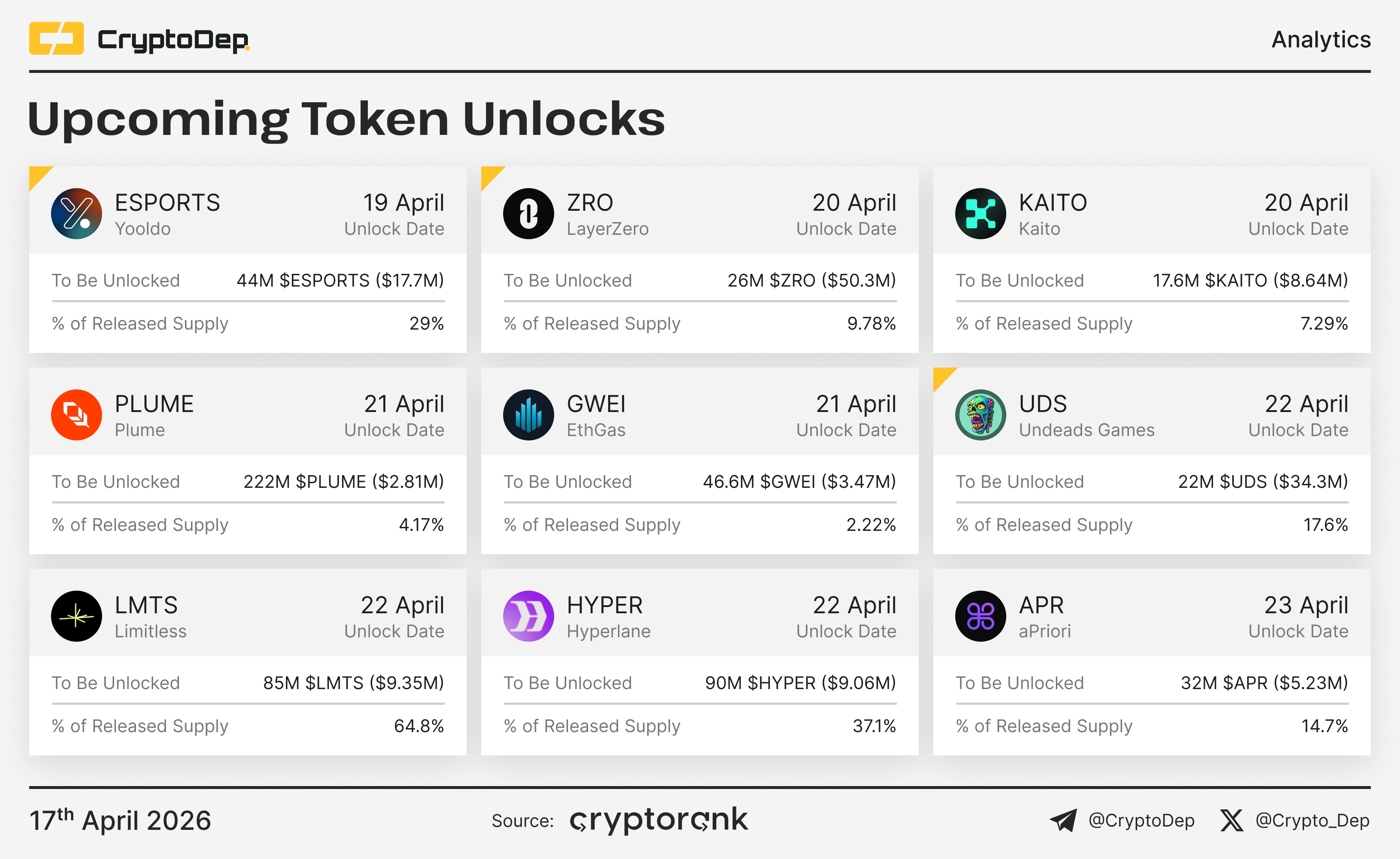 During the next few days, $ZRO, $ESPORTS, $UDS, $HYPER, and $LMTS will have the biggest unlocks.