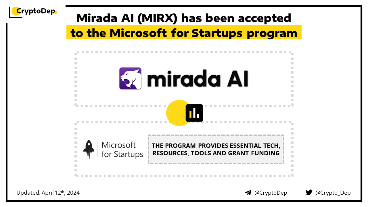 Mirada AI joins the Microsoft for Startups program, the initiative by Microsoft is designed to support startups specializing in AI, providing them with the tools and guidance needed to drive innovation. Through this initiative, Mirada will get access to industry-leading AI tools & services, Microsoft's tech, as well as, grant funding. Mirada AI is a decentralized AI tool, powered by AI via $MIRX, that offers image generation, face-swap, animation, LLM chat, image upscaling, and more.