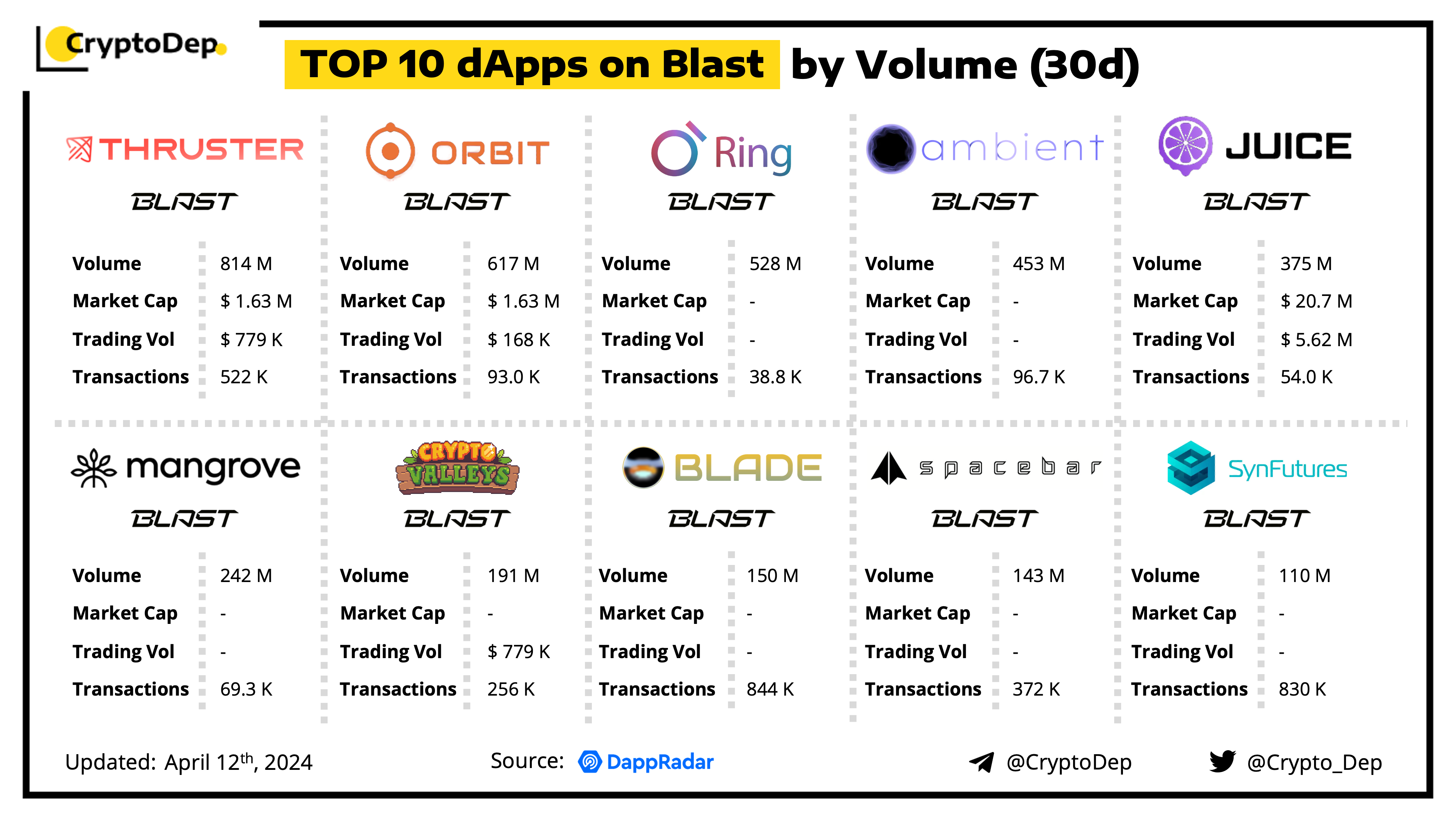 A decentralized application (dApp) is a program built on blockchain that combines a smart contract and a front-end user interface. We present the top dApps on #Blast by volume in the last 30 days, according to the data from DappRadar.