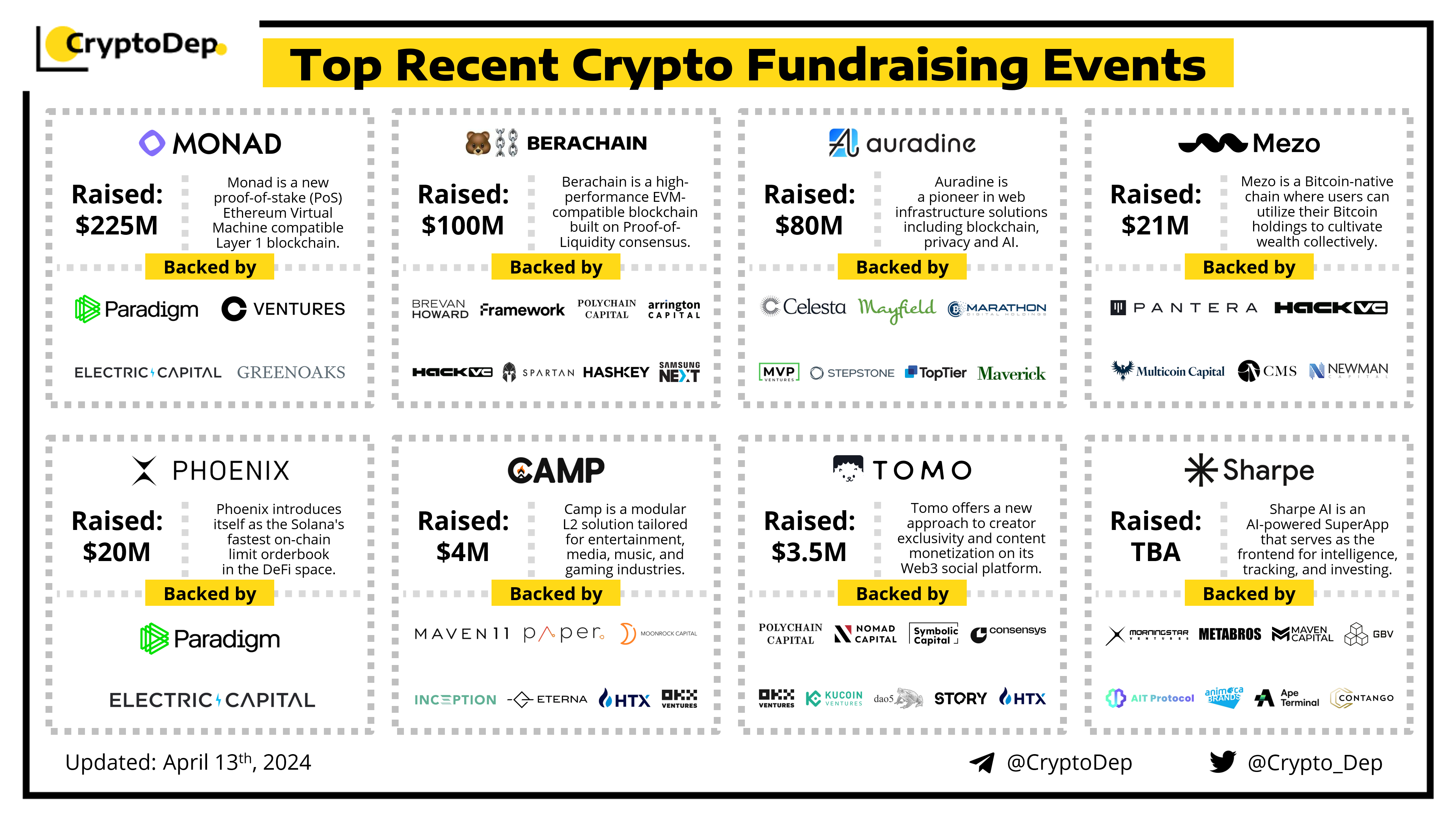 Presenting a list of some recent crypto fundraising events, backed by well-known investors such Paradigm, Pantera Capital, Hack VC, Polychain, Hashkey, Spartan, Consensys, Maven 11, Coinbase Ventures, Electric Capital, GBV Capital, Morningstar Ventures, Framework Ventures, Maven Capital, OKX Ventures, HTX Ventures, Kucoin Ventures, Metabros, Ape Terminal, AIT Protocol, and others. Let's take a look!