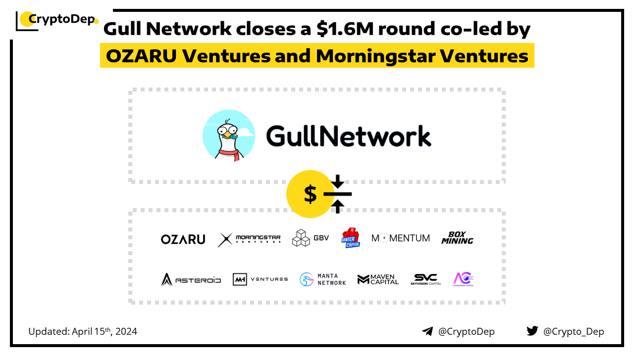 Gull Network has raised $1.6M in a private funding round. The round was co-led by Ozaru Ventures and Morningstar Ventures, with participation from GBV, Momentum 6, MH Ventures, Banter Capital, Maven Capital, Sky Vision Capital, Asteroid Capital, Boxmining, Andromeda Capital, and Manta Network.