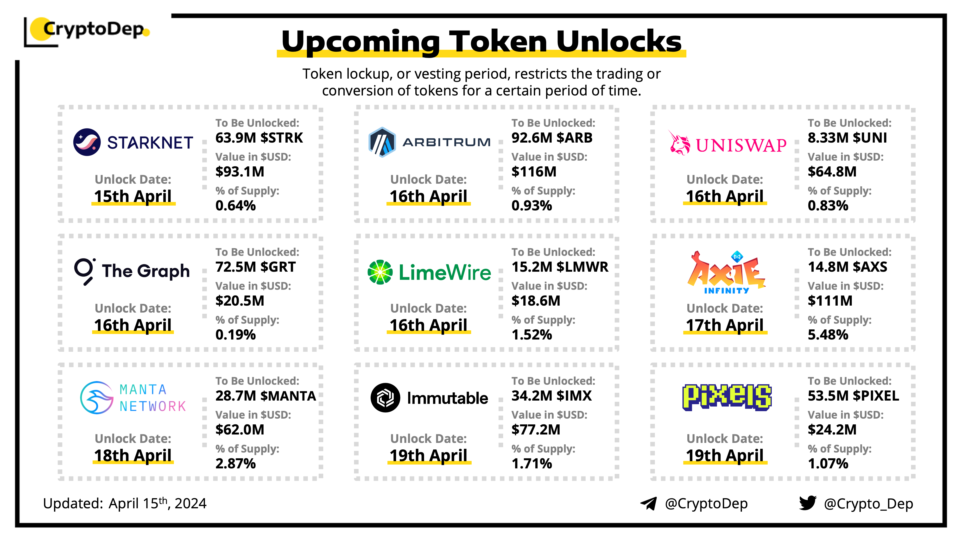 Let's take a look at the compilation of major upcoming token unlocks, diving into details such as dates, amounts, and projects related to tokens that are currently locked up, but will soon be released to the market. During this week, $ARB, $AXS, $STRK, $IMX, and $UNI will have the biggest unlocks.