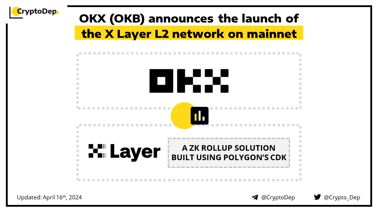 OKX crypto exchange rolls out the public mainnet of X Layer, an Ethereum-based zero-knowledge Layer 2 network built using Polygon's Chain Development Kit. X Layer will allow users to deposit and withdraw crypto via OKX, with access to over 170 dapps. Moreover, the company confirmed that the $OKB token will serve as X Layerβs native asset to pay transaction fees on the network.