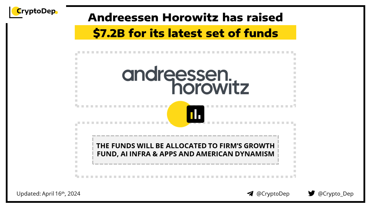 Andreessen Horowitz closes a $7.2B round for its newest set of funds. The investment will be divided into different practices within the firm, including $3.75B for the firm's growth fund, $1.25B for its AI infrastructure, $1B for AI apps, $600M for its "American Dynamism" strategy, and another $600M for its second gaming fund. Andreessen Horowitz is one of Silicon Valleyβs biggest venture capital firms.