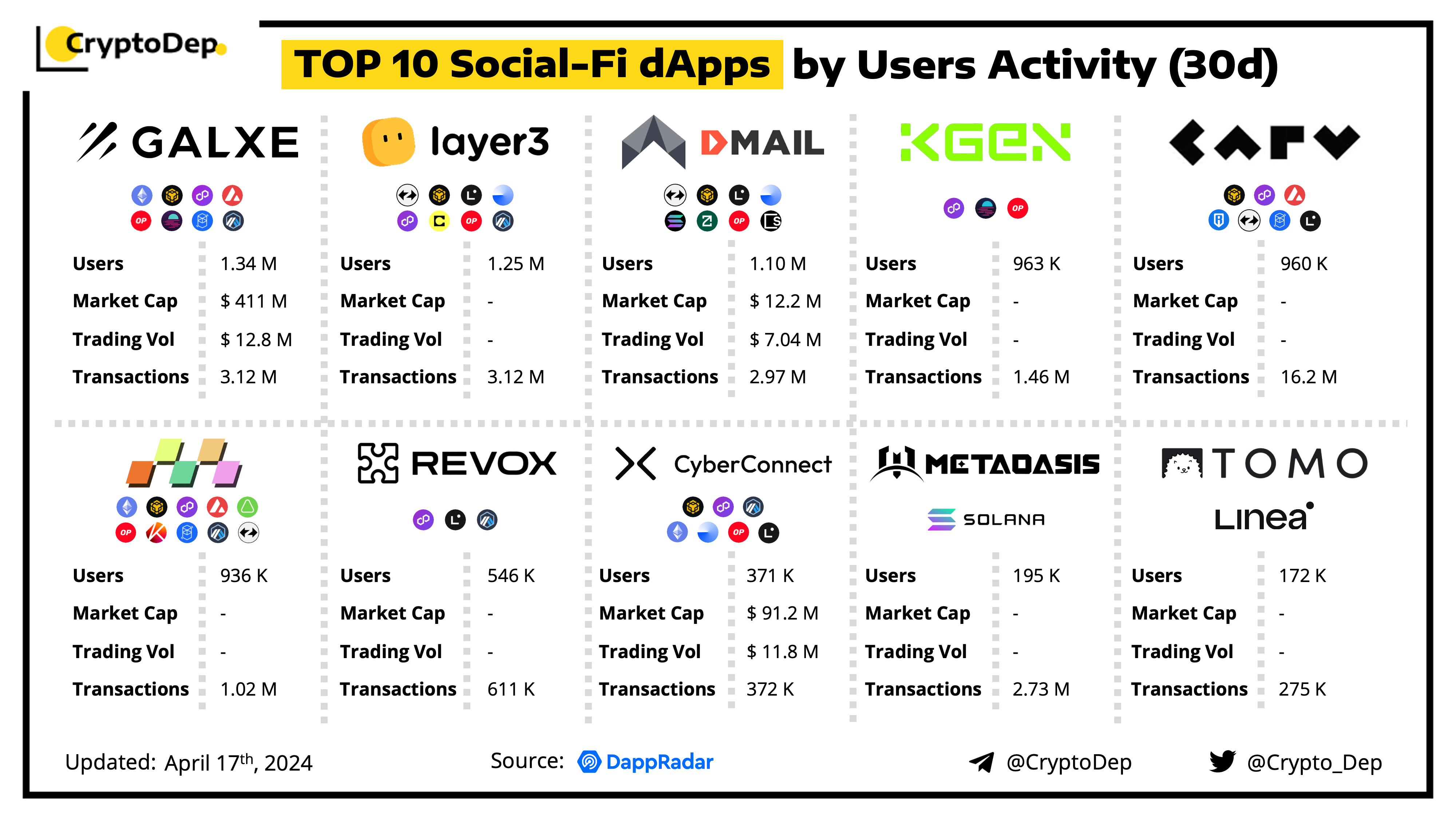 Let's take a look at the top 10 social-fi dApps, based on users' activity over the past 30 days, according to the DappRadar. Social-Fi brings together the principles of social media and DeFi by offering a Web3 approach to creating, managing, and owning social media platforms and the content generated by its participants.