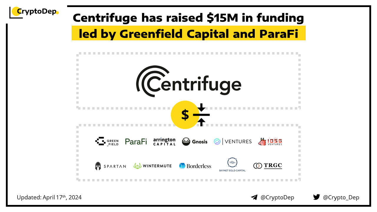 Centrifuge, a platform dedicated to turning real-world assets (RWAs) into loans, closes its $15M investment round led by Greenfield Capital and ParaFi Capital. Additional investors included Circle Ventures, IOSG Ventures, Arrington Capital, The Spartan Group, Wintermute Venture, Bloccelerate, Stake Capital, Gnosis, Skynet Capital, TRGC, and others. The fundraising news comes with a proposal, to build a lending market called Centrifuge Pools.