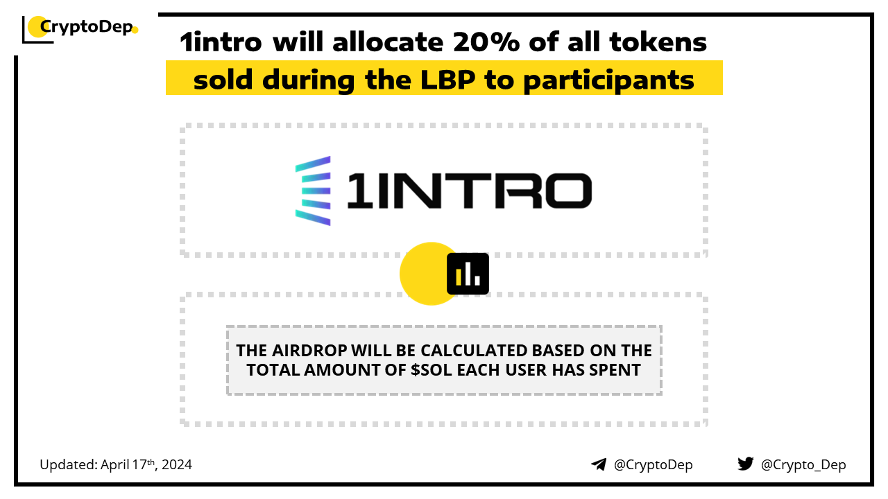 1intro announces an upcoming $INTRO airdrop for the LBP participants with a total reward pool of 20% of all tokens sold during the sale. The airdrop will be calculated based on the total amount of $SOL each user has spent. Users can still take part in the ongoing $INTRO public sale LBP. 1INTRO gives projects the ability to raise capital from retail investors and the community fairly and transparently with retail protection mechanisms enabled.