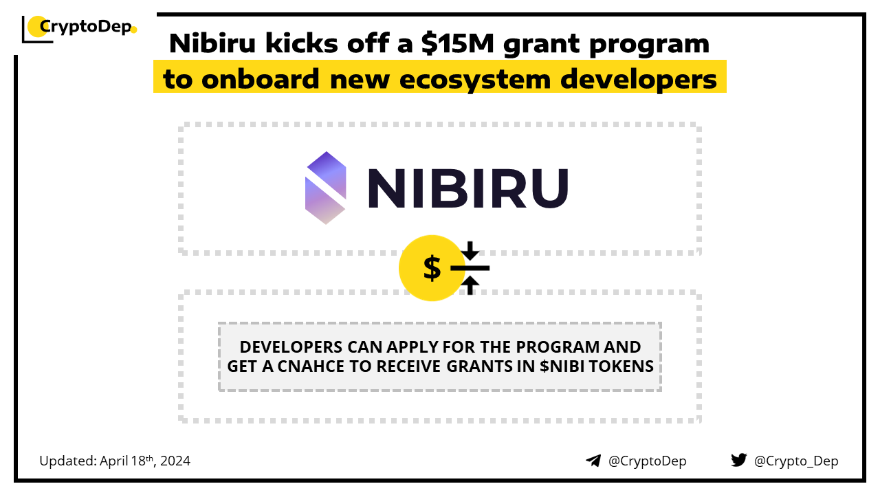 Nibiru has announced the launch of a $15M grant program to promote widespread adoption of its new blockchain. Of the $15M total, $5M will be dedicated to projects based out of Asia, while grants will range from $5,000 to $50,000 in $NIBI. Moreover, successful applicants will receive mentorship support from Tribe Capital, NGC Ventures, ArkStream, and others. Nibiru is an L1 blockchain powering a smart contract hub with DeFi, RWAs, and more, backed by Hashkey, NGC Ventures, ArkStream Capital, MV Global, and others.