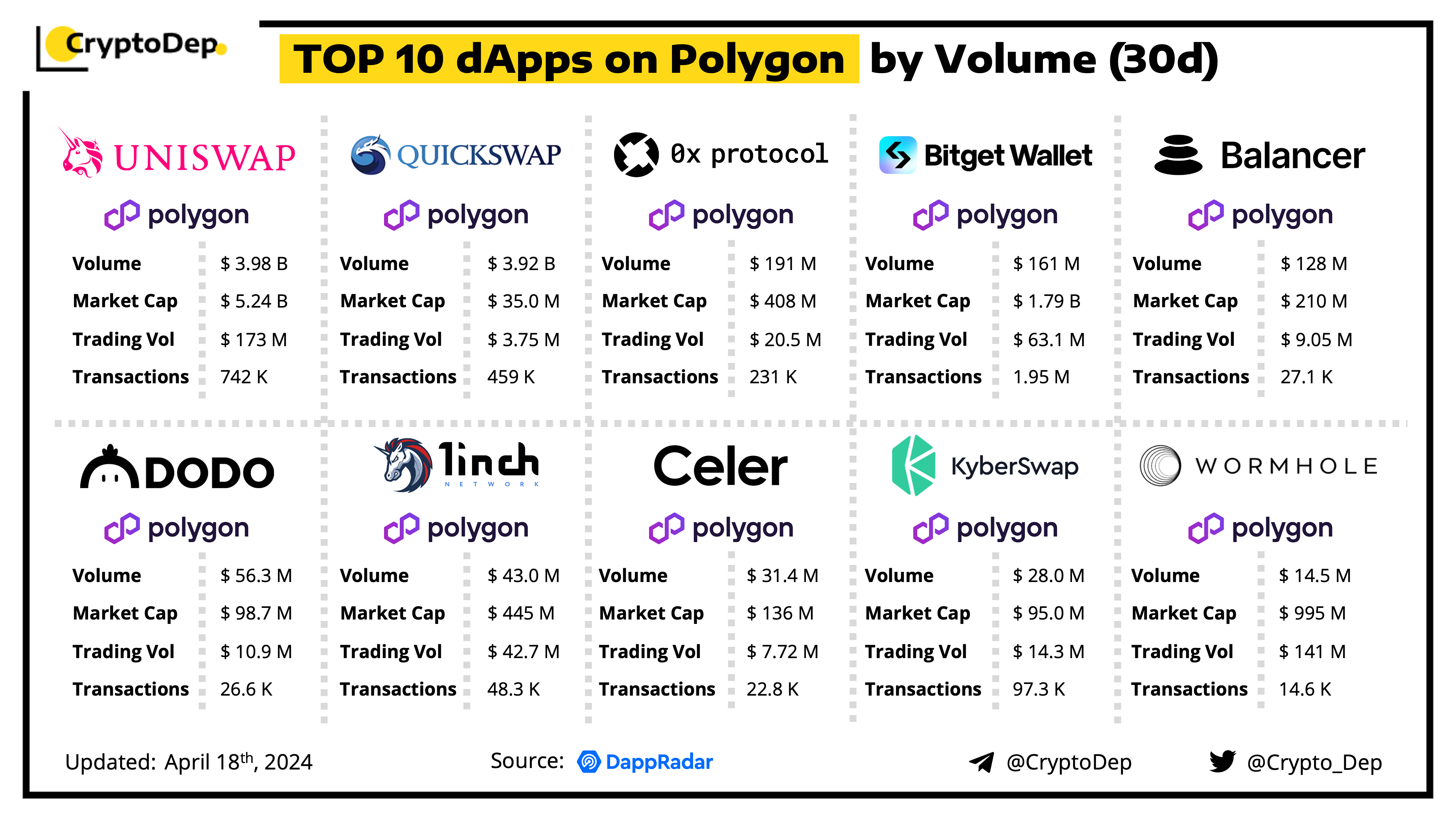 A decentralized application (dApp) is a program built on blockchain that combines a smart contract and a front-end user interface. We present the top dApps on #Polygon by volume in the last 30 days, according to the data from DappRadar.