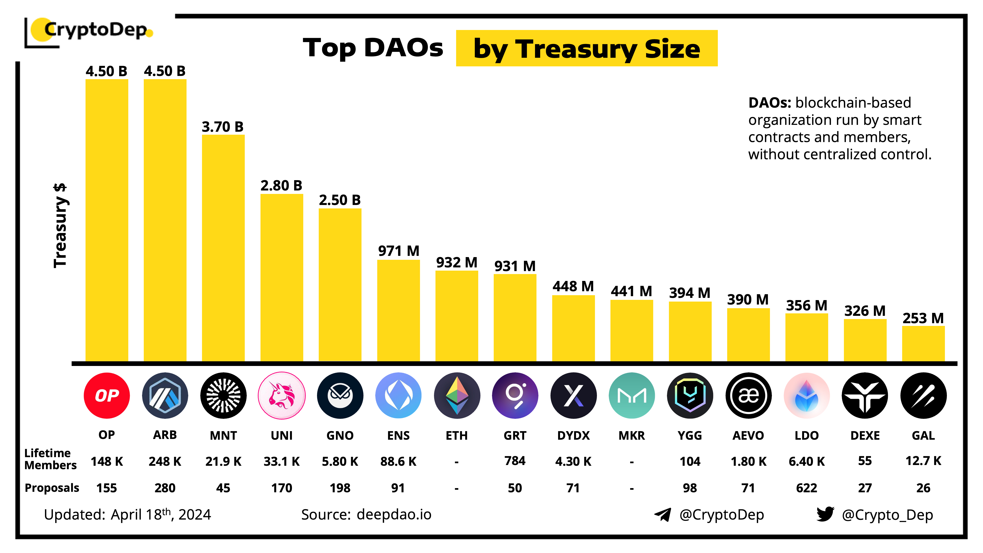 According to the data from DeepDao, as of April 18th, approximately 50,000 DAOs have $30.2B owned assets. We have composed the list of top DAOs, ranked by the total assets that the DAO may use at its discretion.
