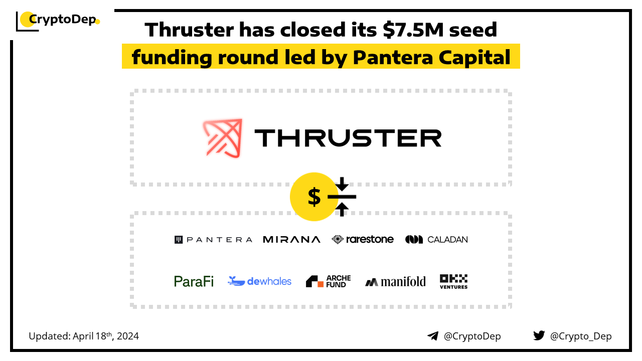 Thruster, a decentralized exchange (DEX) protocol built on Blast, raised $7.5M in seed round. The funding was led by Pantera Capita, with participation from OKX Ventures, ParaFi Capital, Arche Fund, Mirana, Manifold, Dewhales, Rarestone Ventures, Marshland Capital, Caladan, and several angels. The funds will help continue to work with leading builders to integrate Thruster products and liquidity into other top protocols across DeFi, NFTFi, and more.