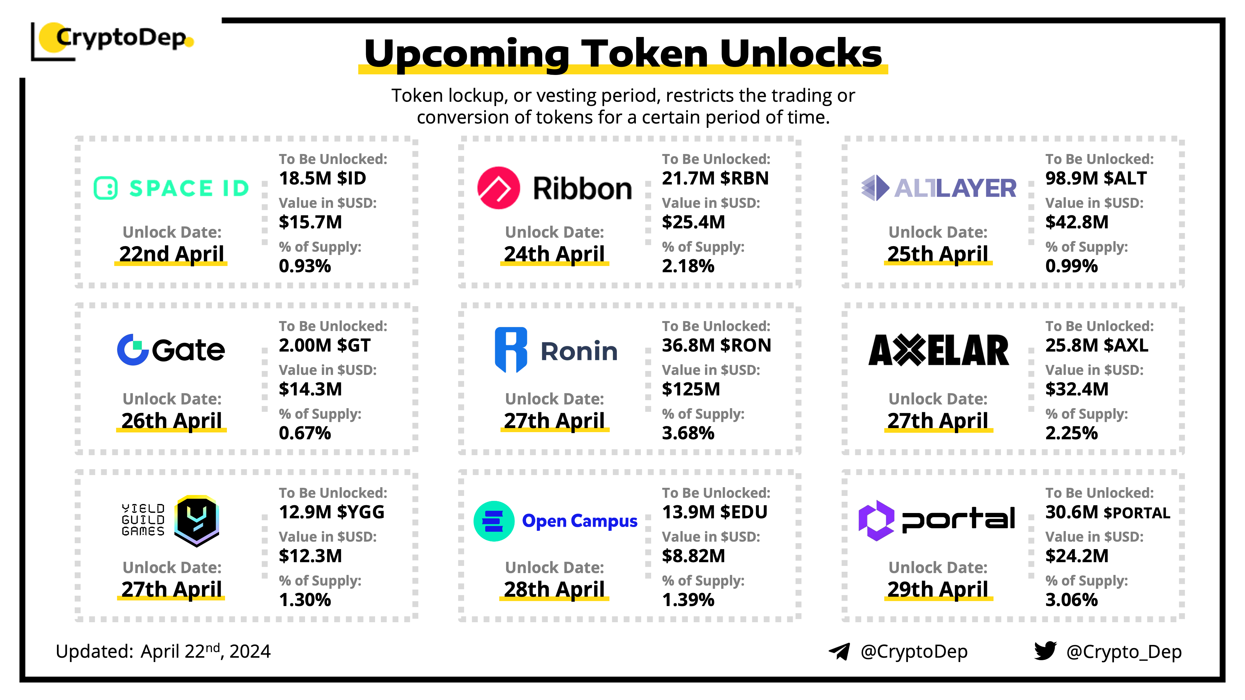 Let's take a look at the compilation of major upcoming token unlocks, diving into details such as dates, amounts, and projects related to tokens that are currently locked up, but will soon be released to the market. During this week, $RON, $ALT, $AXL, $RBN, and $PORTAL will have the biggest unlocks.