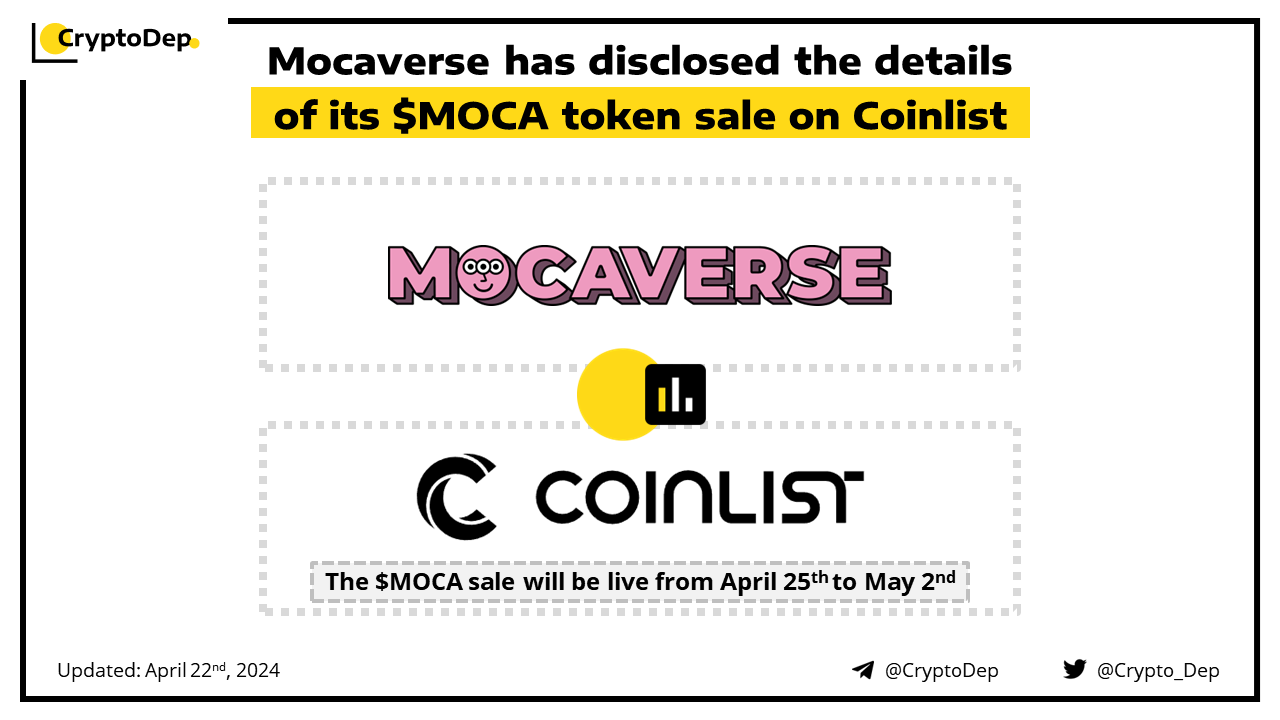 Mocaverse $MOCA token sale will be live on the Coinlist platform from April 25th to May 2nd. The project previously partnered with Coinlist to co-launch MocaList, a token launch platform exclusively for the Mocaverse community. Mocaverse is a gamified metaverse product of Animoca Brands, backed by Polygon Ventures, OKX Ventures, Foresight Ventures, and others.