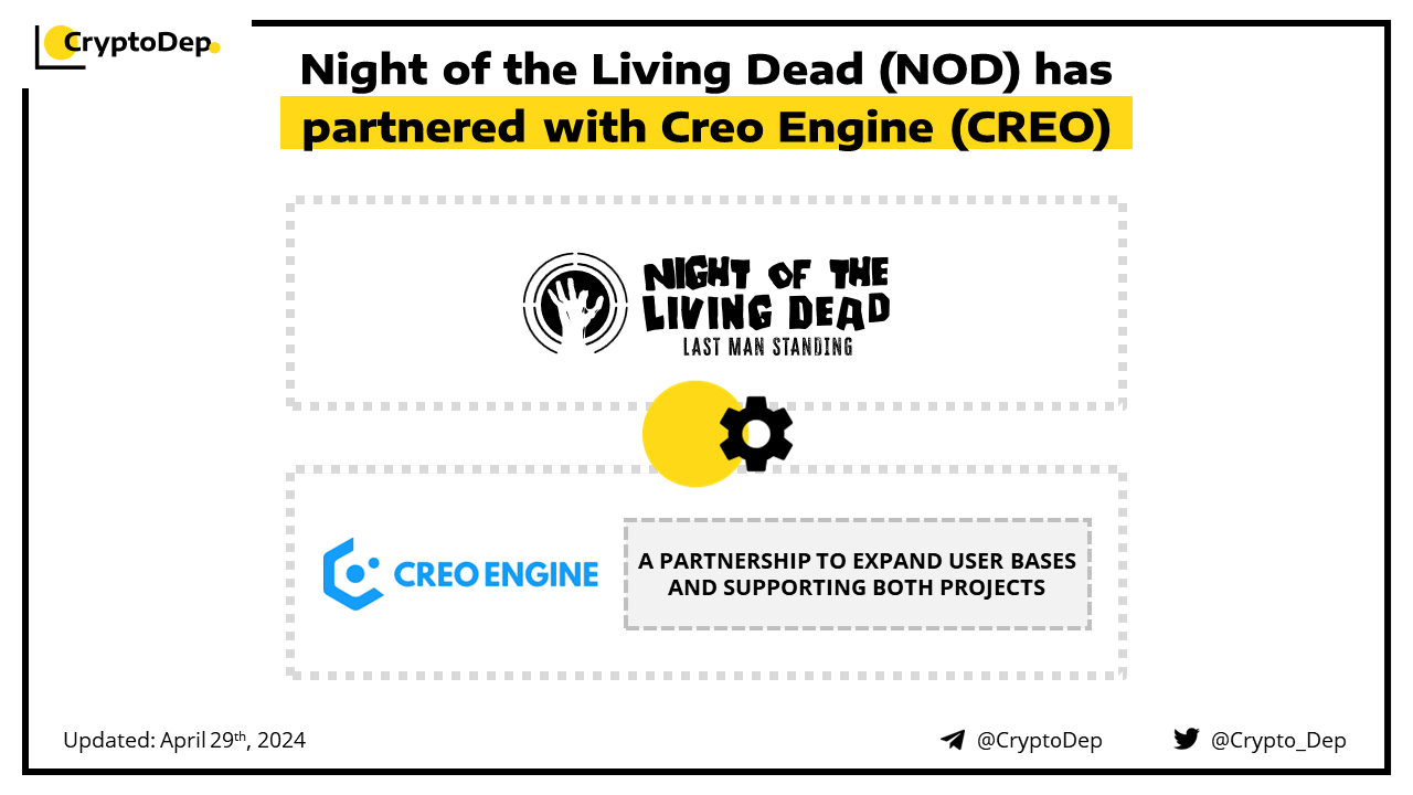 Night of the Living Dead (NOTLD) announces a partnership with Creo Engine. This integration aims to expand user bases and support both projects. Night of the Living Dead is an immersive blockchain-based P2E video game built on Unreal Engine.