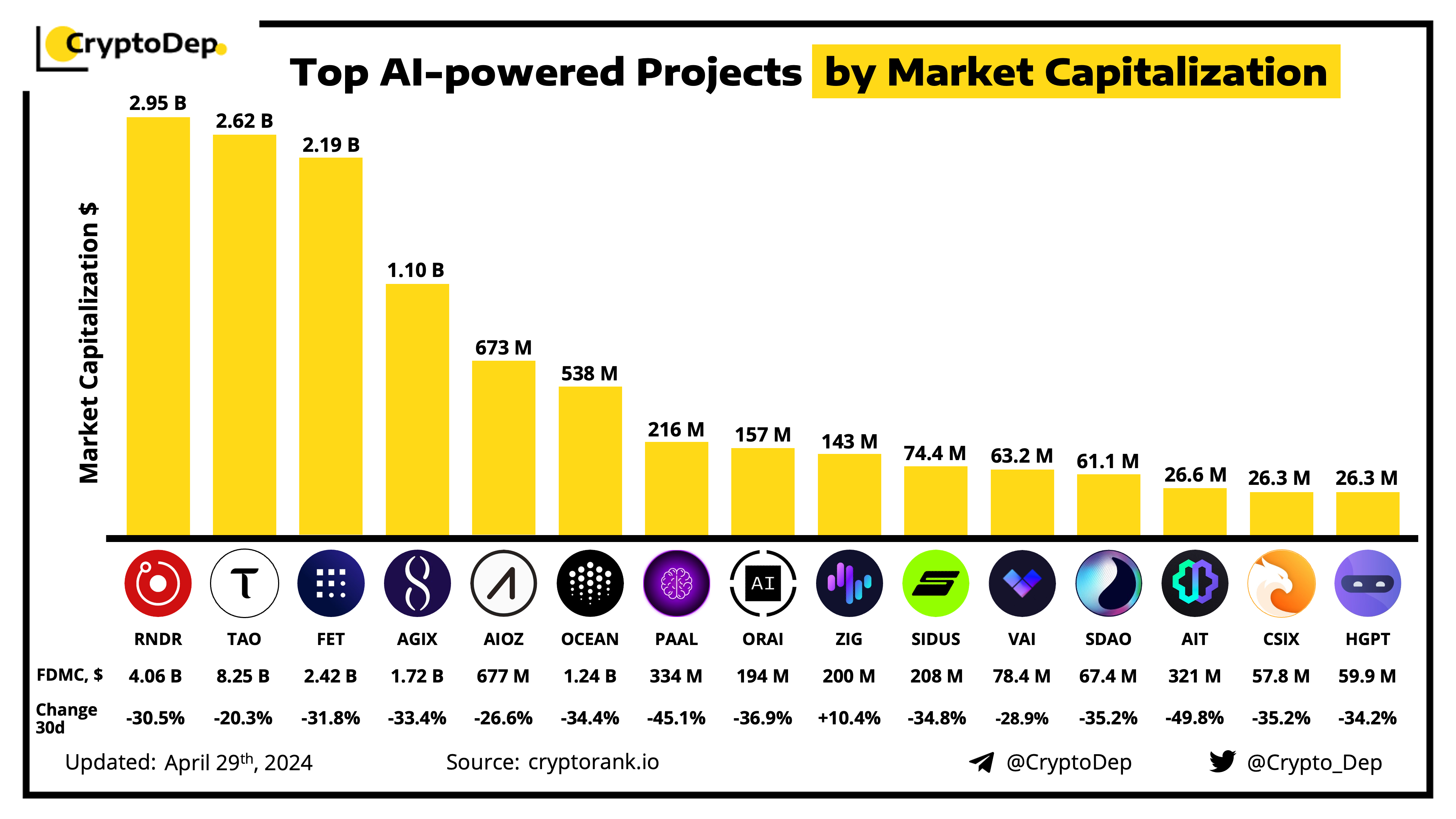 With the rapid growth in popularity and adoption of AI technologies, its implementation has spread into the crypto industry as well. Let's take a dive into the current state of the emerged market and examine the biggest AI-powered crypto projects.