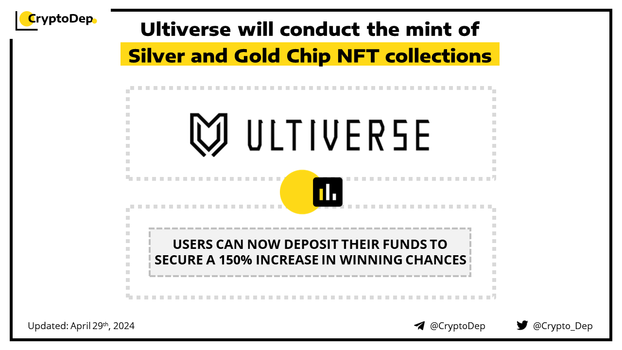 The deposit phase for the mint is now live, users can deposit their funds within the first 24 hours for a 150% increase in winning chances with Silver Chip and Public Lots. The Raffle Phase will start on May 1st, at 12:00 PM UTC. After the $ULTI TGE, holders of Gold Chip NFTs will be able to burn their NFTs to receive 50,000 $ULTI tokens. Ultiverse is building the web3 social gaming metaverse, by connecting web3 with an immersive VR-compatible virtual world.