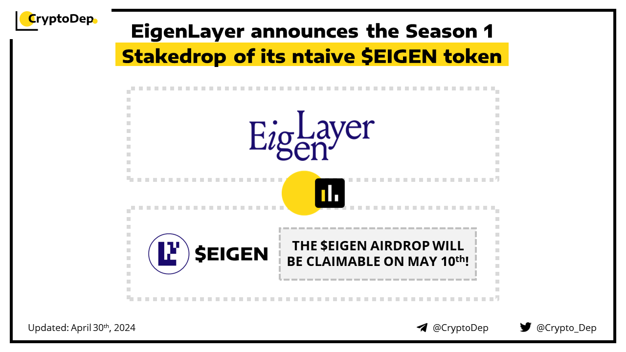 EigenLayer has introduced Eigen Foundation, $EIGEN token, and an upcoming season 1 stakedrop. Some 15% of the EIGEN total supply allocated to the airdrop while season 1 reward will include 5% allocated to restakers, based on the snapshot taken on March 15th.