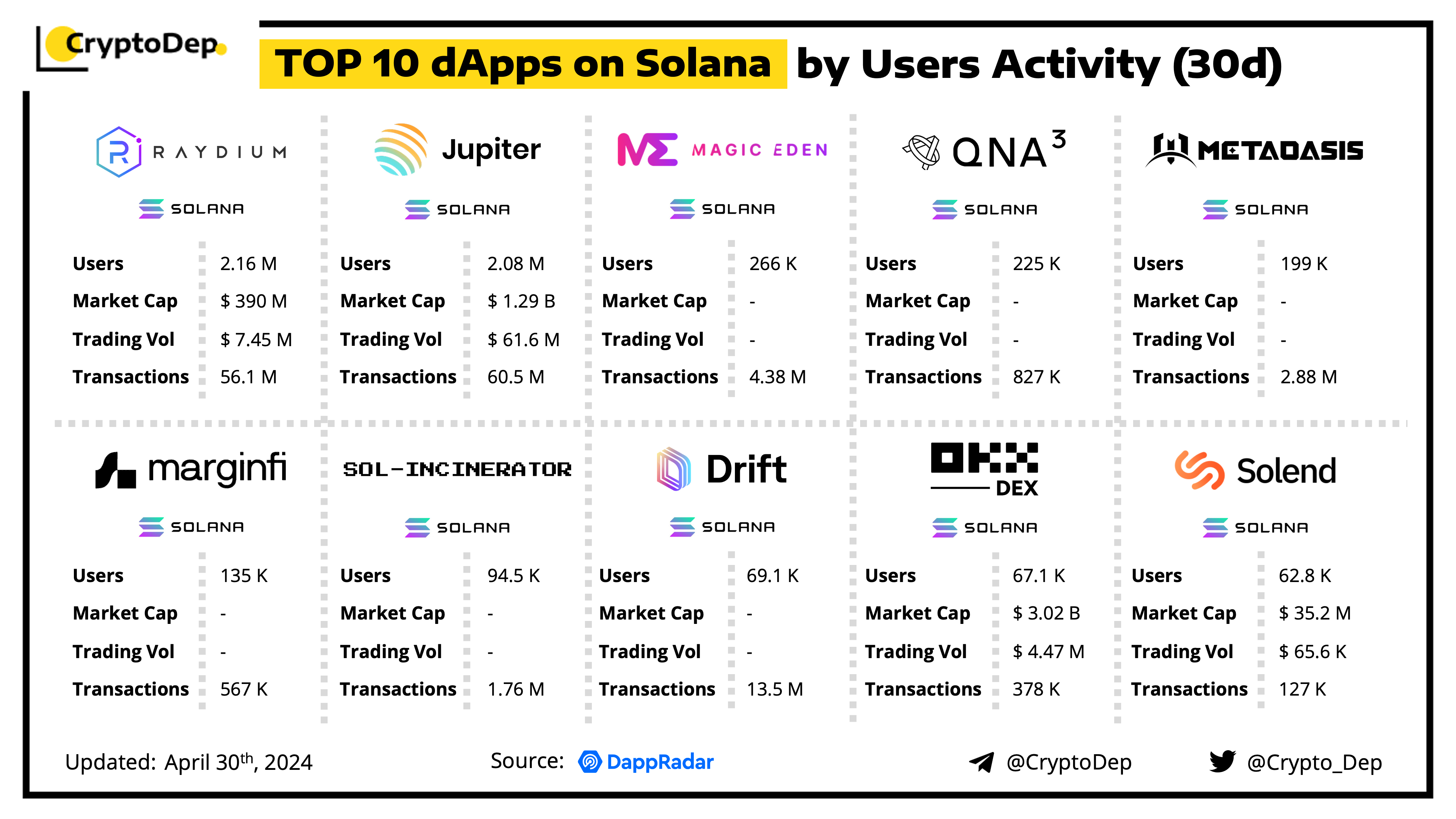 A decentralized application (dApp) is a program built on blockchain that combines a smart contract and a front-end user interface. We present the top dApps on #Solana by users activity in the last 30 days, according to the data from DappRadar.