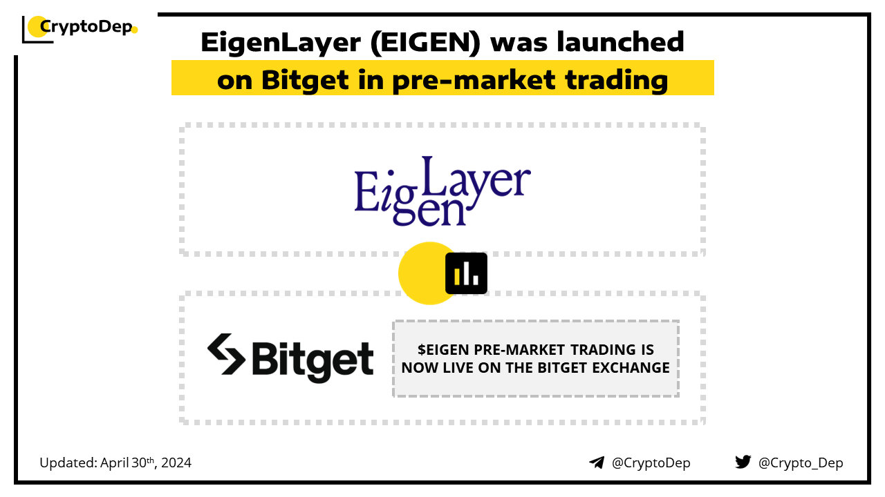 Pre-market trading for $EIGEN is now live on the Bitget exchange! Users can now trade $EIGEN in advance, before it becomes available for spot trading. EigenLayer is a protocol built on Ethereum that introduces re-staking.
