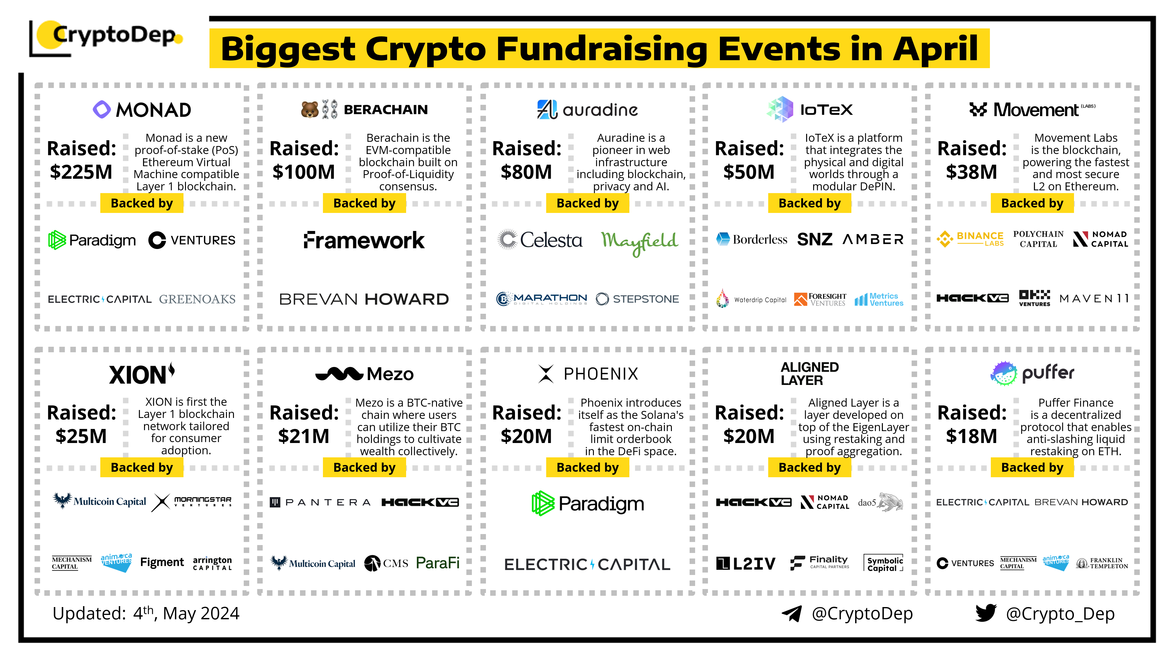 Presenting a list of the biggest crypto fundraising rounds in April 2024, backed by well-known investors such as Paradigm, Pantera Capital, Polychain, Binance Labs, Multicoin Capital, Electric Capital, Hack VC, Mechanism Capital, Coinbase Ventures, Animoca Brands, Morningstar Ventures, Framework Ventures, OKX Ventures, and others. Let's take a look!