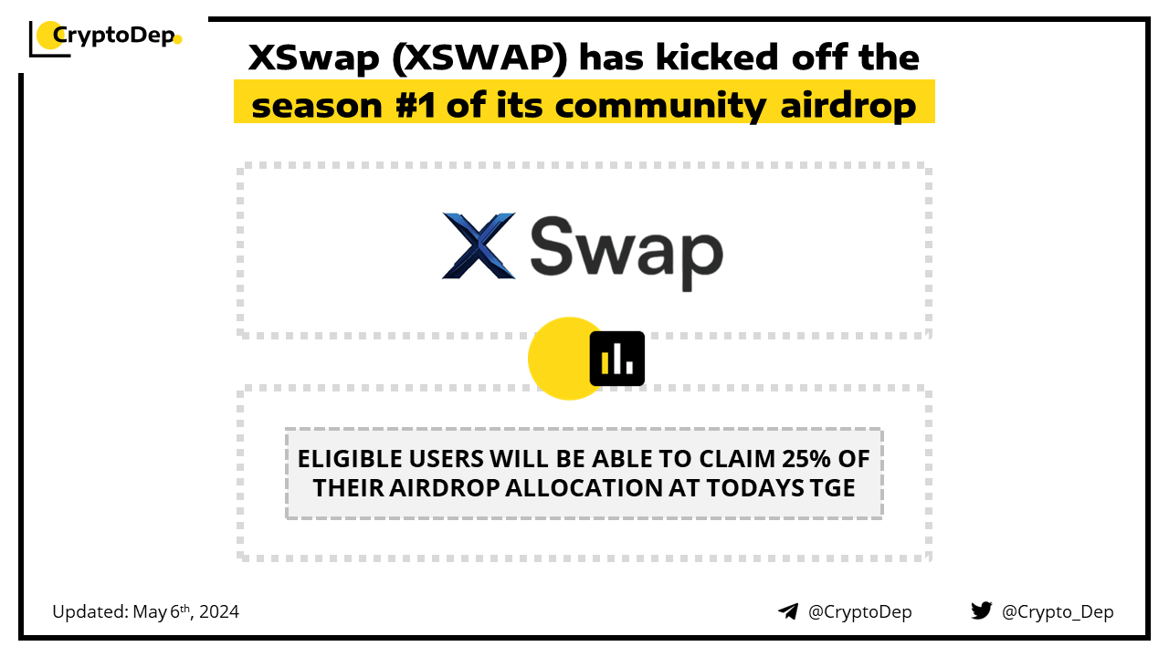 XSwap announces the launch of the Season #1 $XSWAP airdrop. Users' allocations are dependent on their activity in different fields. Eligible users will be able to claim 25% of their airdrop immediately and receive the remaining 75% through a three-month linear vesting period. However, the platform gives users an option to lose the additional 20% bonus but claim all of their tokens right away. The airdrop rewards will be available for claims for 14 days, starting from $XSWAP TGE that will take place today, on May 6th, at 14:00 UTC.