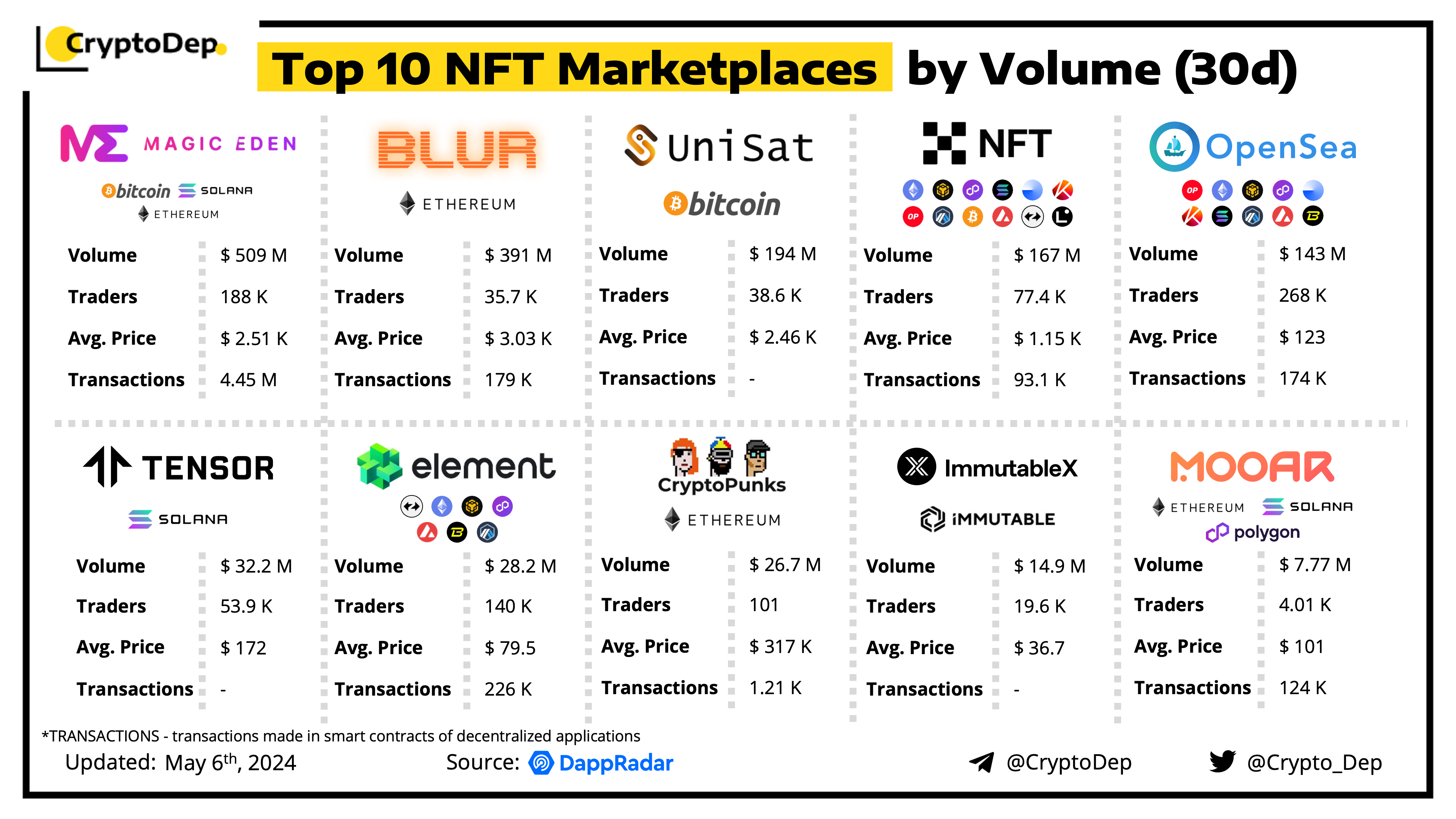 An NFT marketplace is a digital platform for buying and selling NFTs. Let's take a look at some of the best-performed NFT marketplaces by volume in the last 30 days, according to the data from DappRadar.