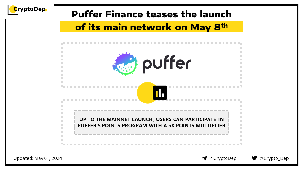 Puffer Finance has announced an upcoming launch of its liquid restaking protocol on mainnet on May 8th. Up to the mainnet launch, users can participate in Puffer's five-stage points program with a 5x points multiplier. The project has previously raised $24.27M in funding from Binance Labs, Lemniscap, Faction, Animoca Brands, and others.