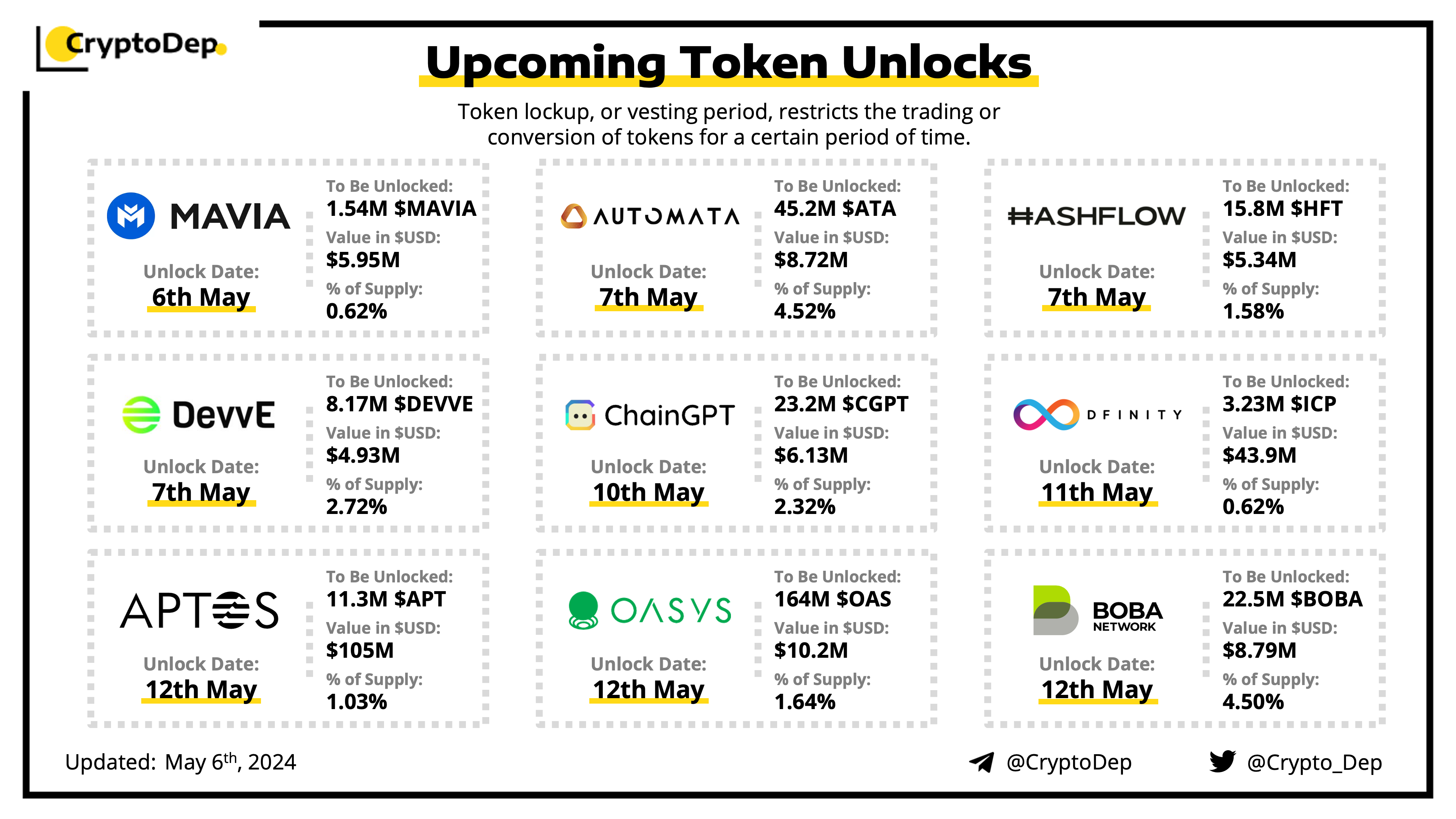 Let's take a look at the compilation of major upcoming token unlocks, diving into details such as dates, amounts, and projects related to tokens that are currently locked up, but will soon be released to the market. During this week, $APT, $ICP, $OAS, $BOBA, and $ATA will have the biggest unlocks.