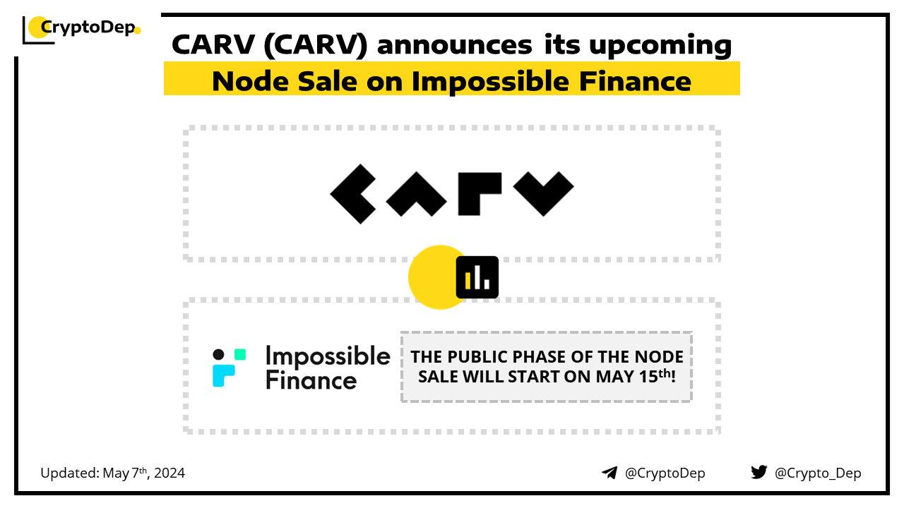 CARV will hold its Node Sale on the Impossible Finance platform. The sale will be divided into the whitelist and public phases offering 450 and 100,000 nodes respectively. Users can now participate in the IDIA Staking Campaign and enter the whitelist sale phase on May 13th, at 12:00 PM UTC. The public Node Sale will begin on May 15th, at 12:00 PM UTC. The project has previously raised $10M in its Series A funding from OKX Ventures, IOSG Ventures, Fenbushi Capital, Hashkey, and others. CARV Protocol is a modular data layer for gaming and AI.