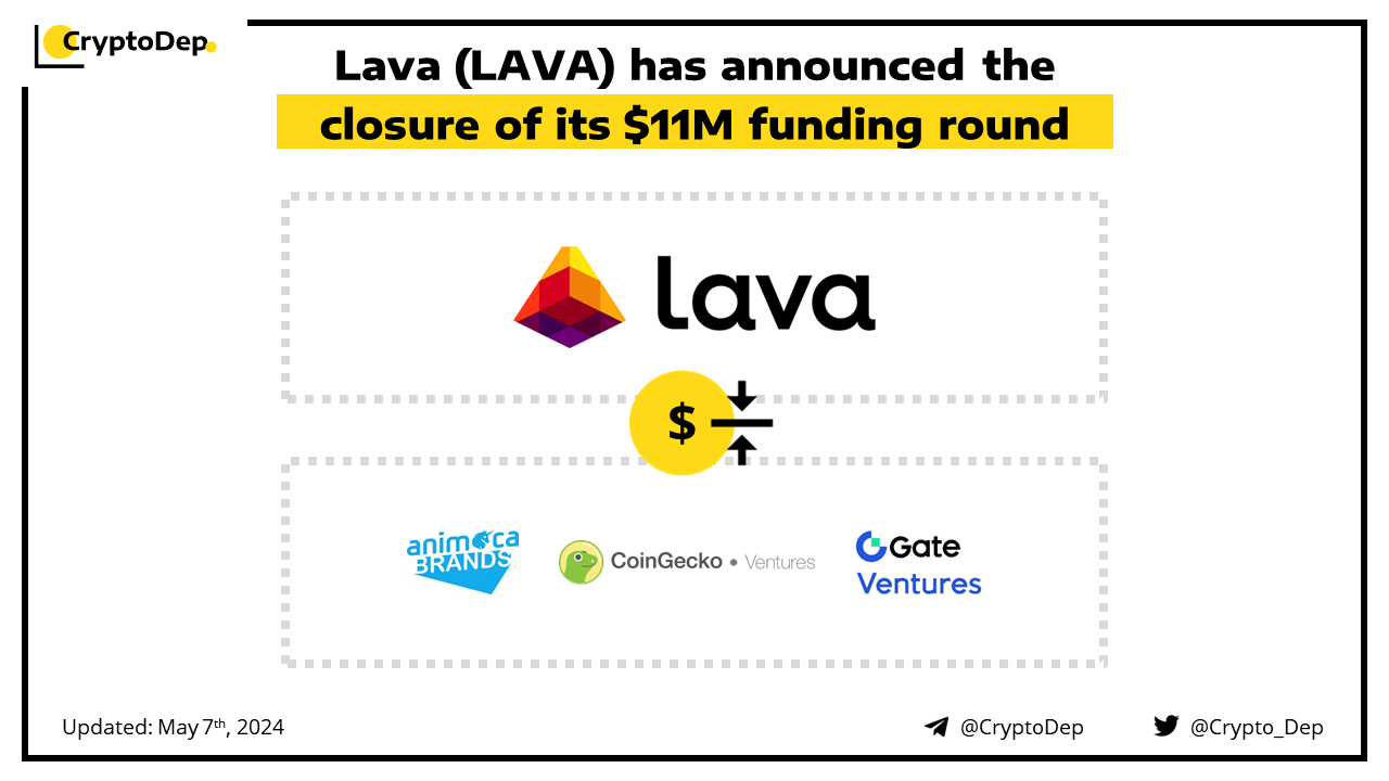 Lava Foundation raises $11M to continue the development of the Lava Network, a modular blockchain infrastructure developer. Among investors are Animoca Brands, GatΠ΅.ΡΠΎ Ventures, CoinGecko Ventures, Sandeep Nailwal, Ash Crypto, CryptoLark, and others. The funding comes ahead of the network's mainnet launch and $LAVA token airdrop. The project has previously raised a $15M seed round backed by Jump Capital, Hashkey Capital, and Alliance DAO among others.