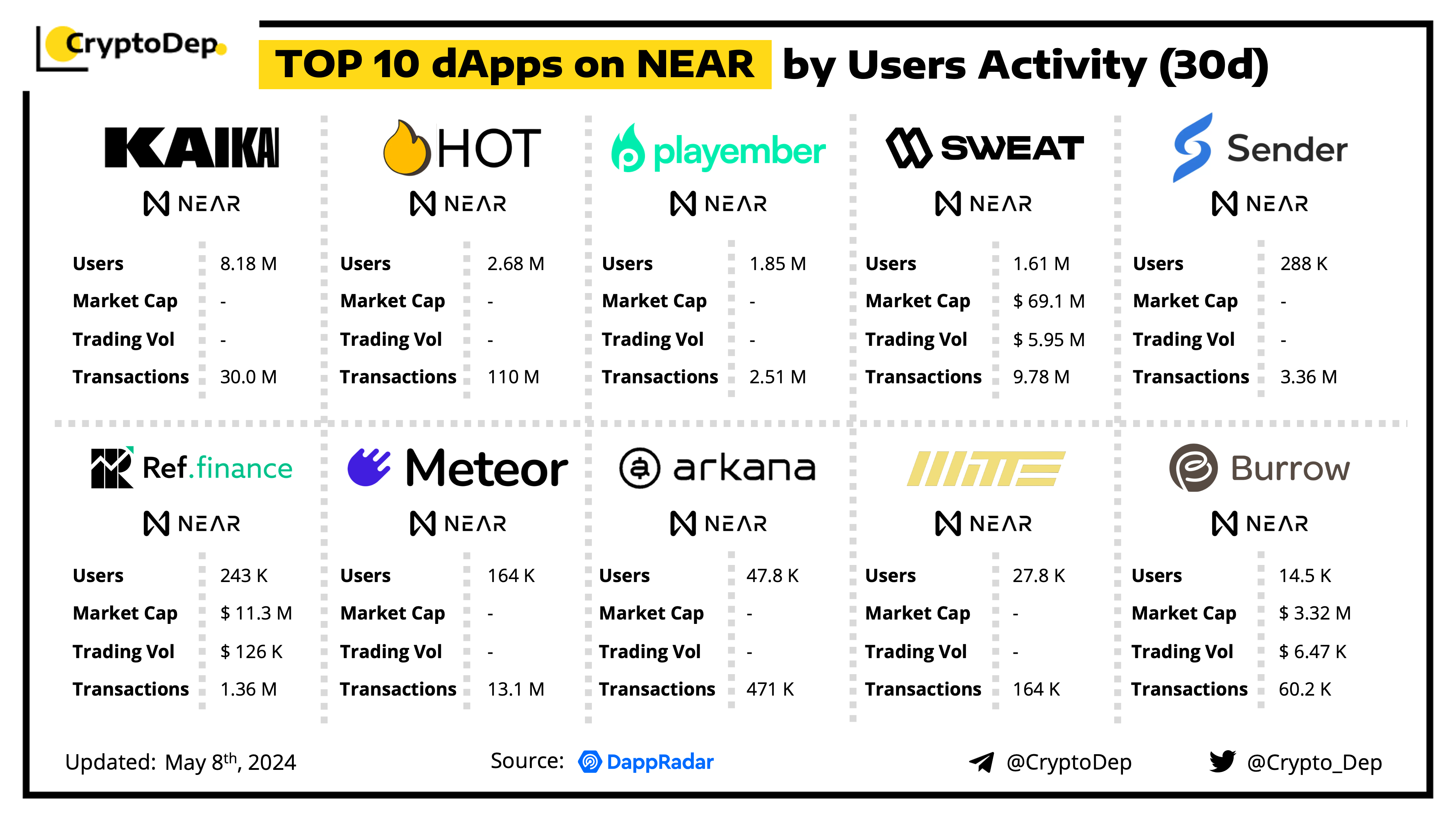 A decentralized application (dApp) is a program built on blockchain that combines a smart contract and a front-end user interface. We present the top dApps on #NEAR by users activity in the last 30 days, according to the data from DappRadar.