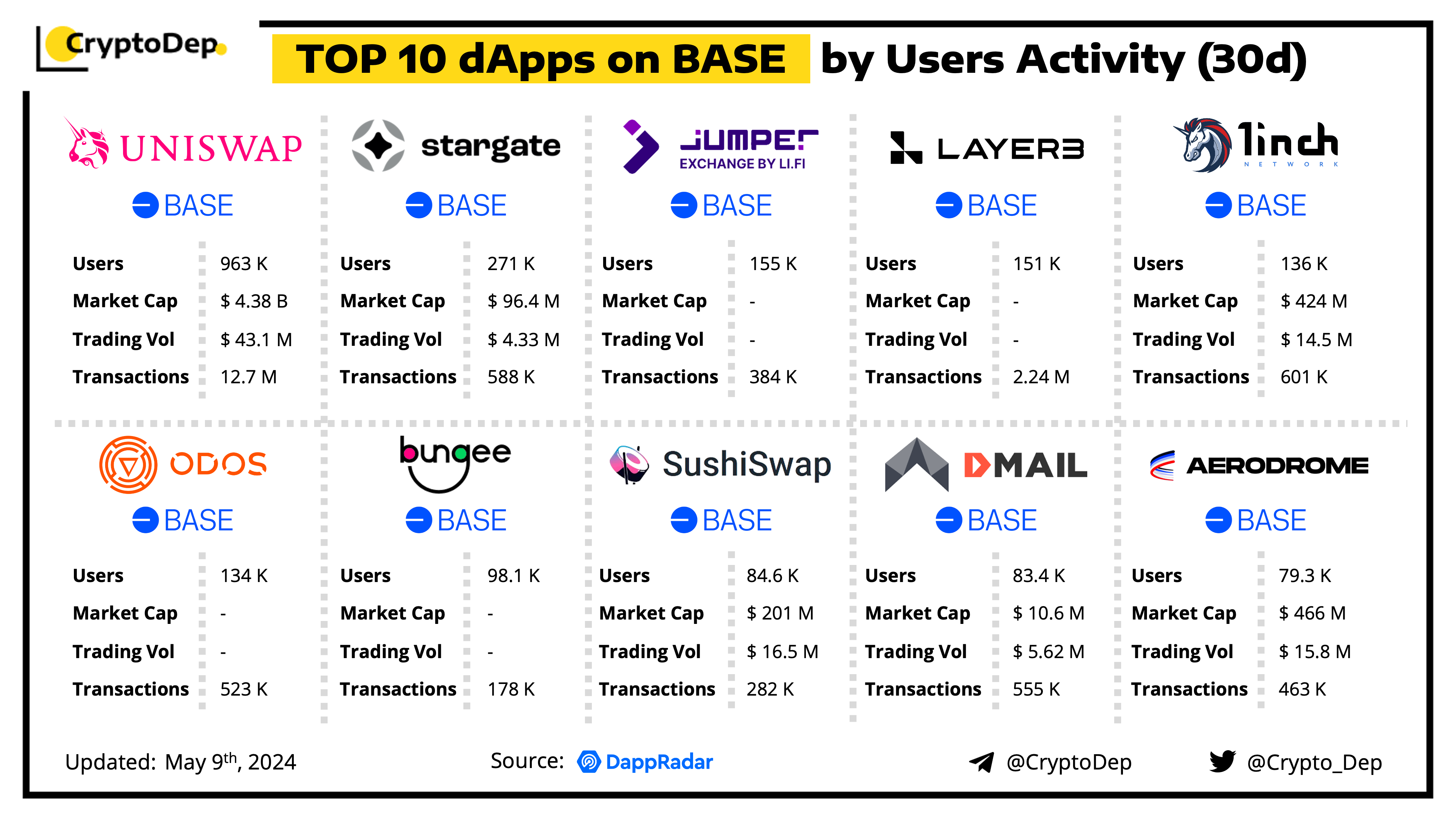 A decentralized application (dApp) is a program built on blockchain that combines a smart contract and a front-end user interface. We present the top dApps on #Base by users activity in the last 30 days, according to the data from DappRadar.