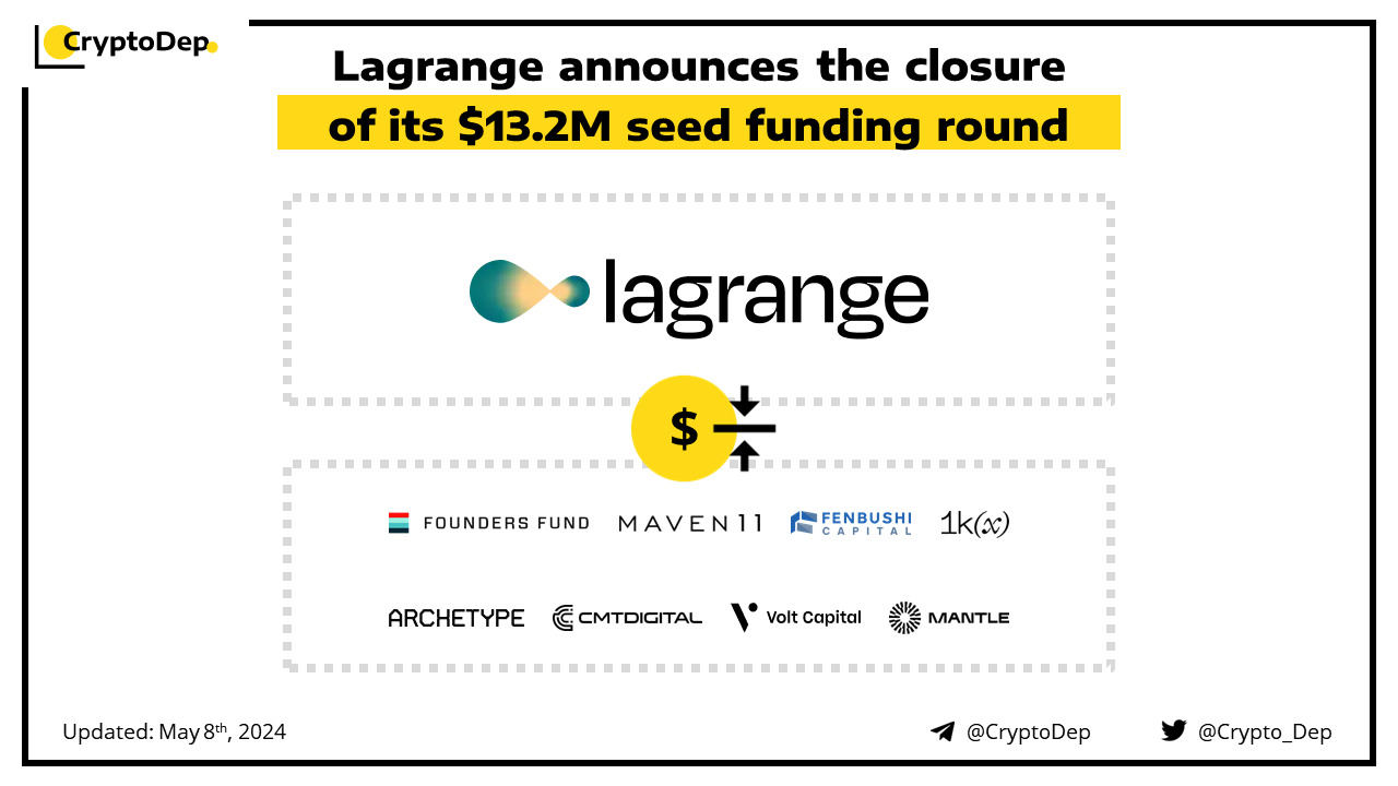 Lagrange Labs, a startup that specializes in zero-knowledge (ZK) proofs, has raised $13.2M in a seed round led by led by Founders Fund, with participation from Archetype Ventures, 1kx, Maven11, Fenbushi Capital, Volt Capital, CMT Digital, Mantle Ecosystem Fund, and several angels.