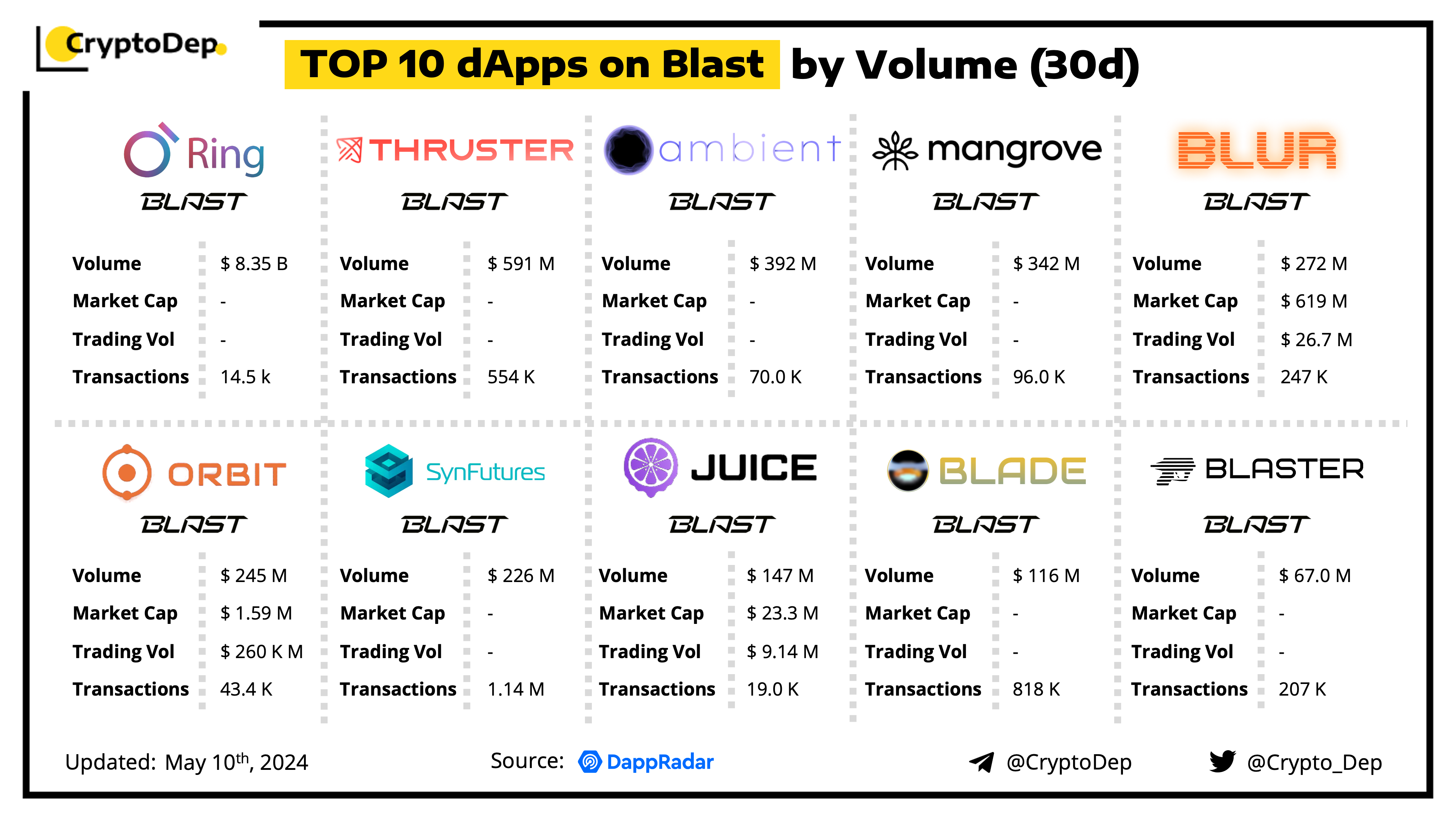 A decentralized application (dApp) is a program built on blockchain that combines a smart contract and a front-end user interface. We present the top dApps on #Blast by volume in the last 30 days, according to the data from DappRadar.