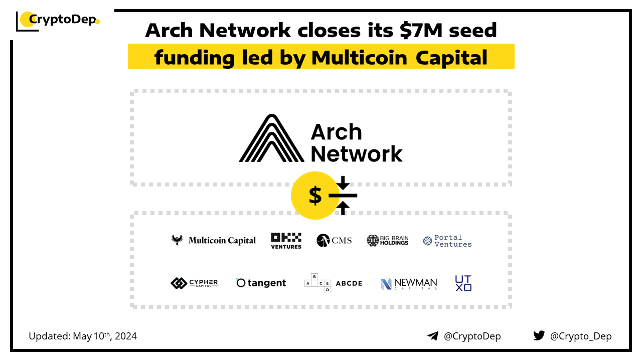 Arch Network, a Bitcoin-native application platform, raises $7M in funding led by Multicoin Capital. Additional round participants included CMS Holdings, OKX Ventures, ABCDE, Big Brain Holdings, Cypher Capital, Newman Capital, Portal Ventures, UTXO Management, and tangent among others. By providing a platform for programmability on Bitcoin, Arch aims to bring the advancements and innovations from other blockchains to Bitcoin.