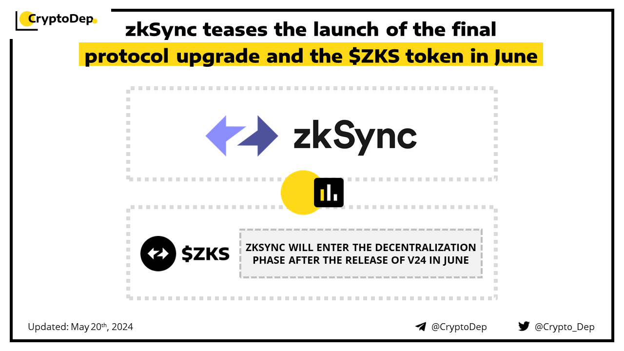 zkSync unveils an upcoming launch of the v24 protocol upgrade that will take place in June, kickstarting the decentralization phase alongside the $ZKS token. zkSync is a ZK-rollup-powered trustless Layer 2 protocol for scalable low-cost payments on Ethereum. Previously, the project has raised $458M from a16z, Coinbase Ventures, Ethereum Foundation, Hashed, Coinfund, Dragonfly, and others.
