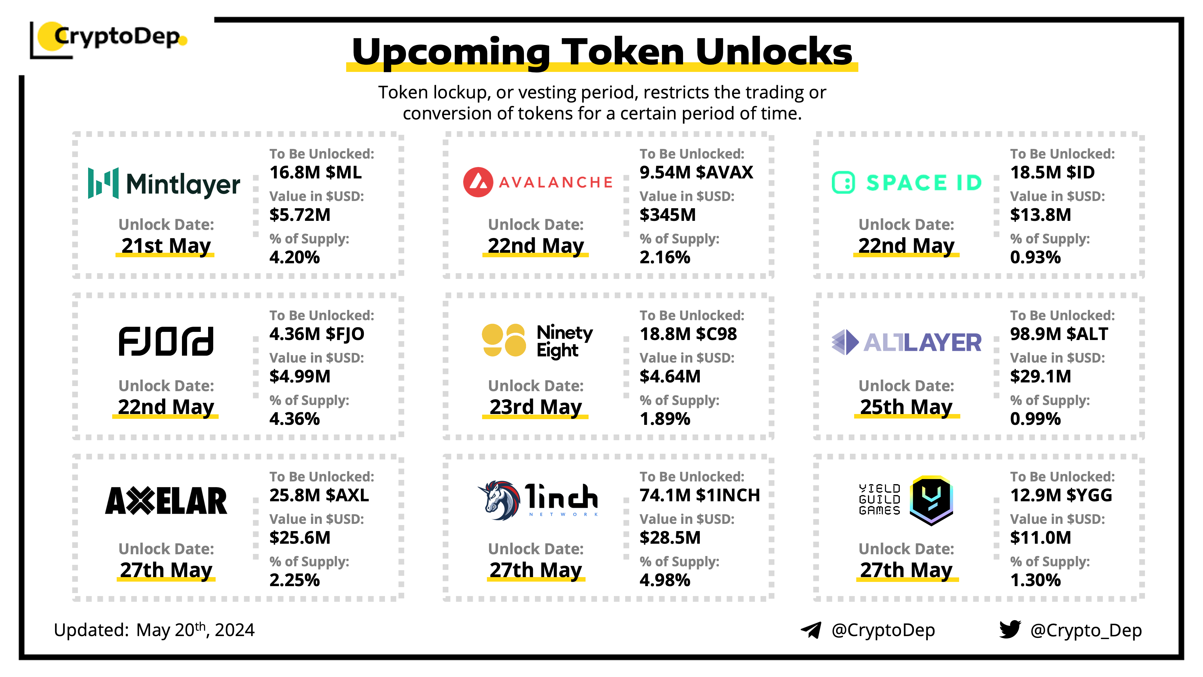 Let's take a look at the compilation of major upcoming token unlocks, diving into details such as dates, amounts, and projects related to tokens that are currently locked up, but will soon be released to the market. During this week, $AVAX, $ALT, $1INCH, $AXL, and $ID will have the biggest unlocks.