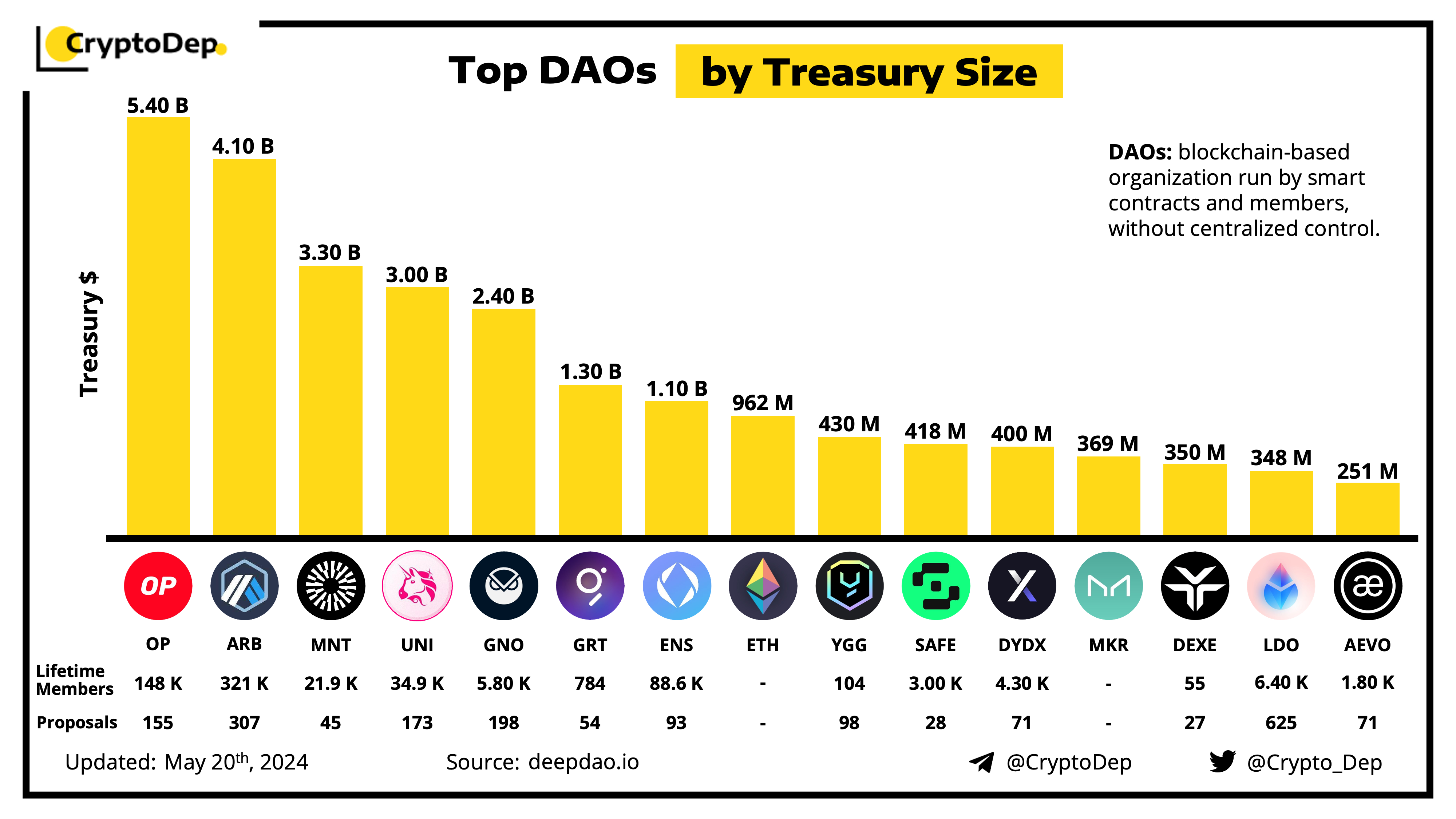 According to the data from DeepDao, as of May 20th, approximately 50,000 DAOs have $30B owned assets. We have composed the list of top DAOs, ranked by the total assets that the DAO may use at its discretion.