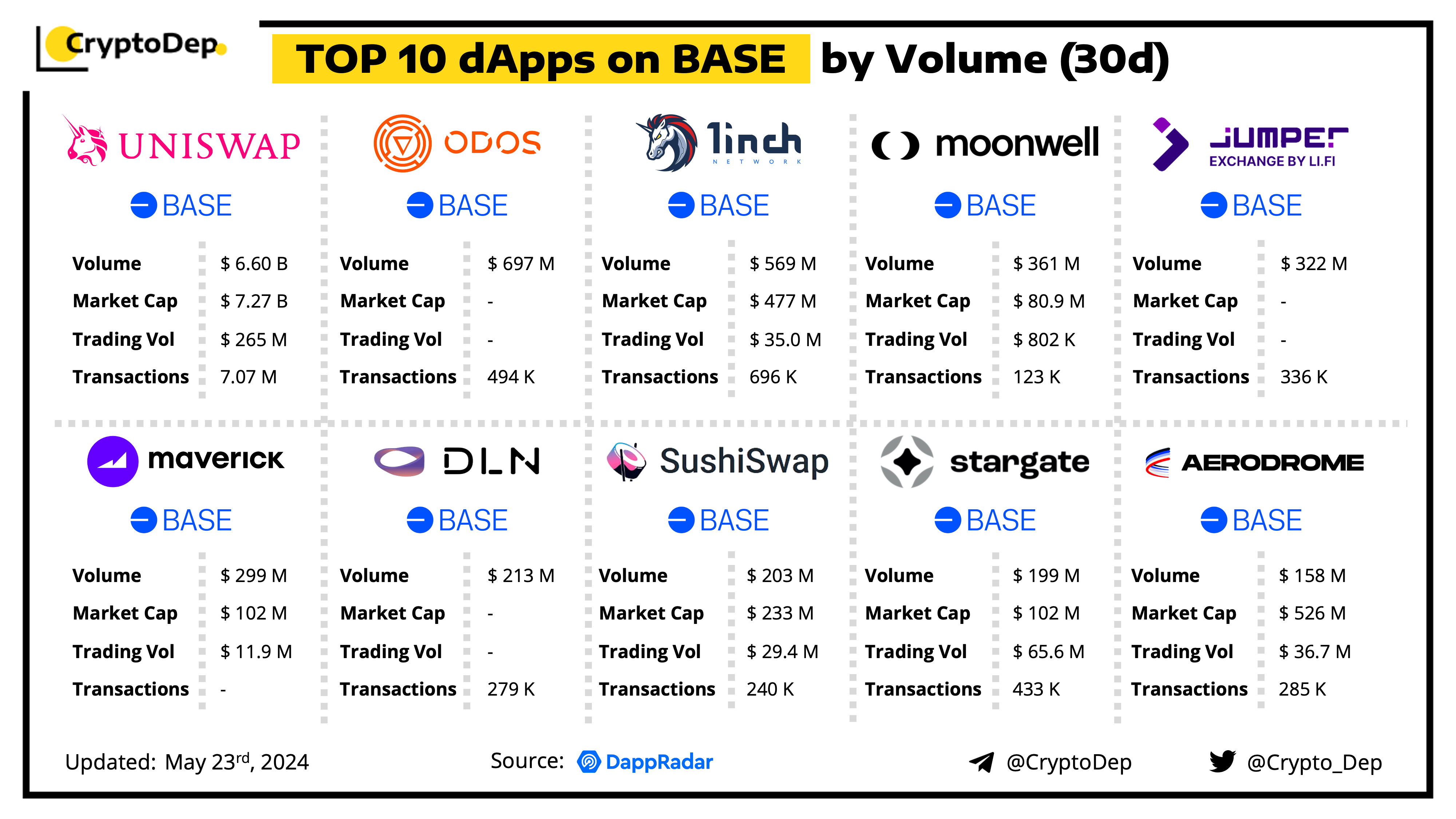 A decentralized application (dApp) is a program built on blockchain that combines a smart contract and a front-end user interface. We present the top dApps on #Base by volume in the last 30 days, according to the data from DappRadar.