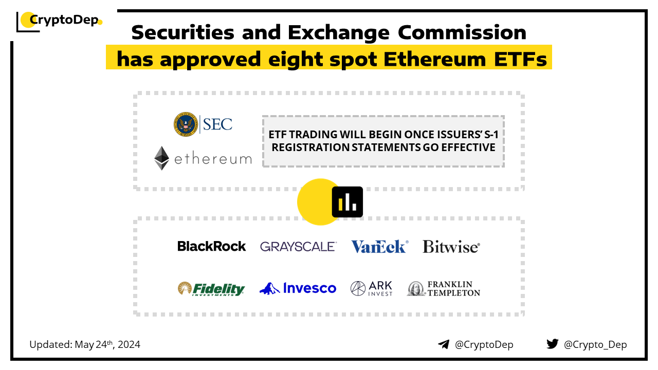 The U.S. Securities and Exchange Commission approved eight spot Ethereum ETFs from BlackRock, Fidelity, Grayscale, Bitwise, VanEck, Ark, Invesco Galaxy, and Franklin Templeton. The ETF issuers need to have their S-1 registration statements go effective before trading can begin. The approval comes four months after the agency approved spot Bitcoin ETFs for the first time.