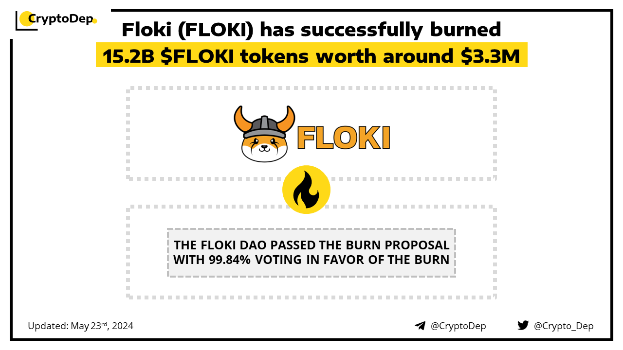 Floki announces a successful burn of 15.2B $FLOKI tokens worth ~$3.31M. The Floki DAO passed the burn proposal with 99.84% voting in favor of the burn. The tokens came from one of the affected wallets from the blacklisted wallet in July 2022. The project returned 1% of the tokens that were returned to the affected wallet and burned 99% of the sum. Floki Inu is a decentralized platform that aims to bring together the global community of dog lovers and crypto enthusiasts.