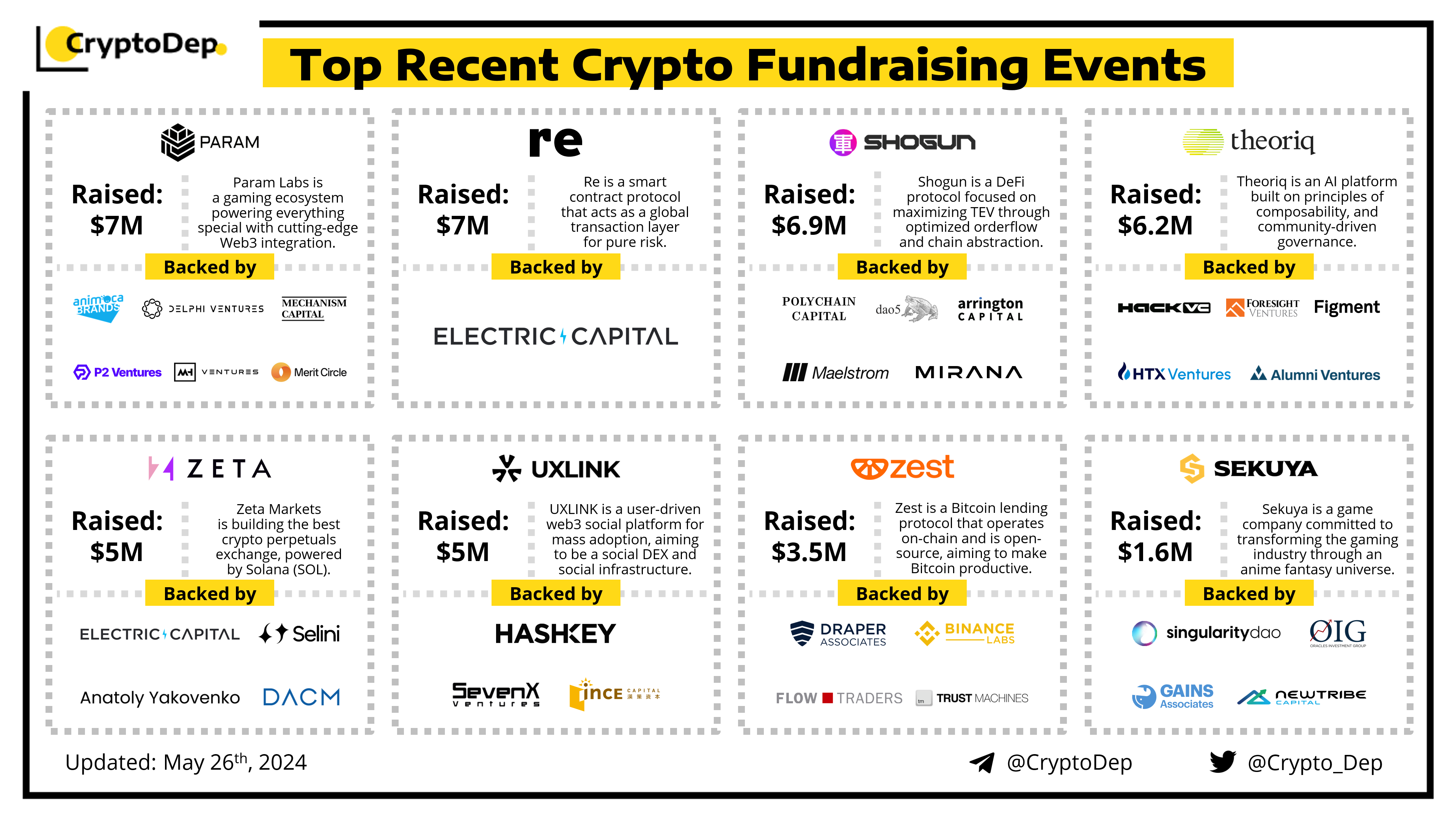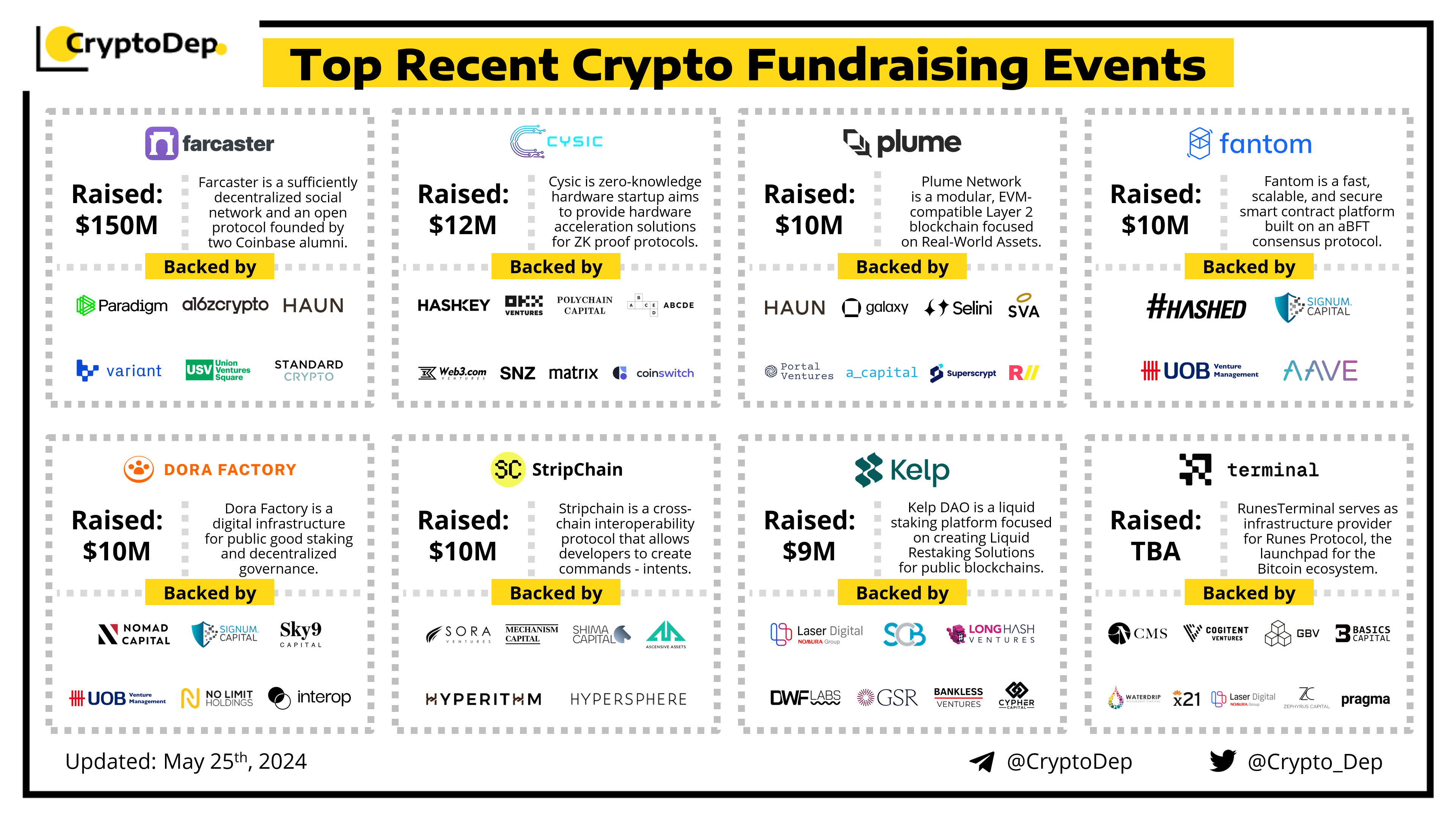 Presenting a list of some recent crypto fundraising events, backed by well-known investors such as Paradigm, a16z crypto, Polychain, Hashkey, GBV Capital, Hashed, Haun, Waterdrip Capital, Variant Fund, Mechanism Capital, OKX Ventures, Signum Capital, CMS, Laser Digital, Shima Capital, and others. Let's take a look!