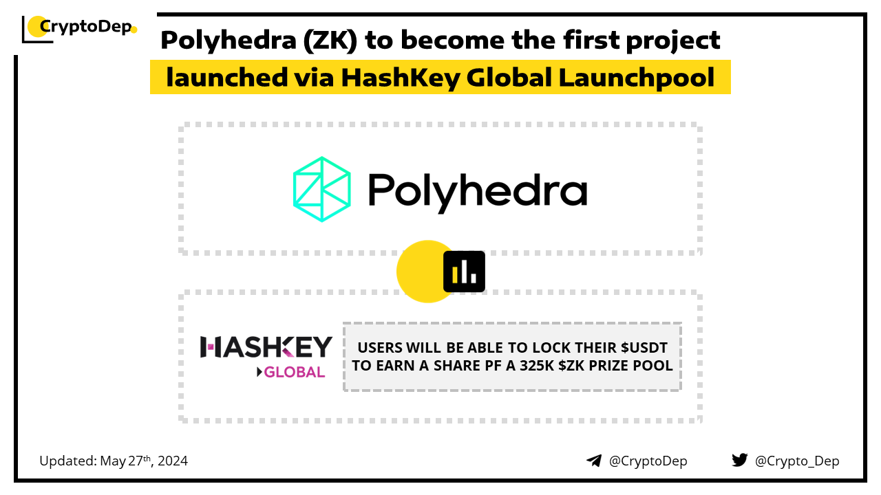 Polyhedra will be launched on HashKey Global Launchpool with 325K $ZK in rewards. Deposits and withdrawals for $ZK are now open while farming and trading for the $ZK token will start on May 30th, at 10:00 AM UTC. Users will be able to lock their $USDT and earn a share of the 325K $ZK prize pool. Polyhedra Network is building secure, interoperable, and scalable Web3 infrastructure with advanced zero-knowledge-proof technology.