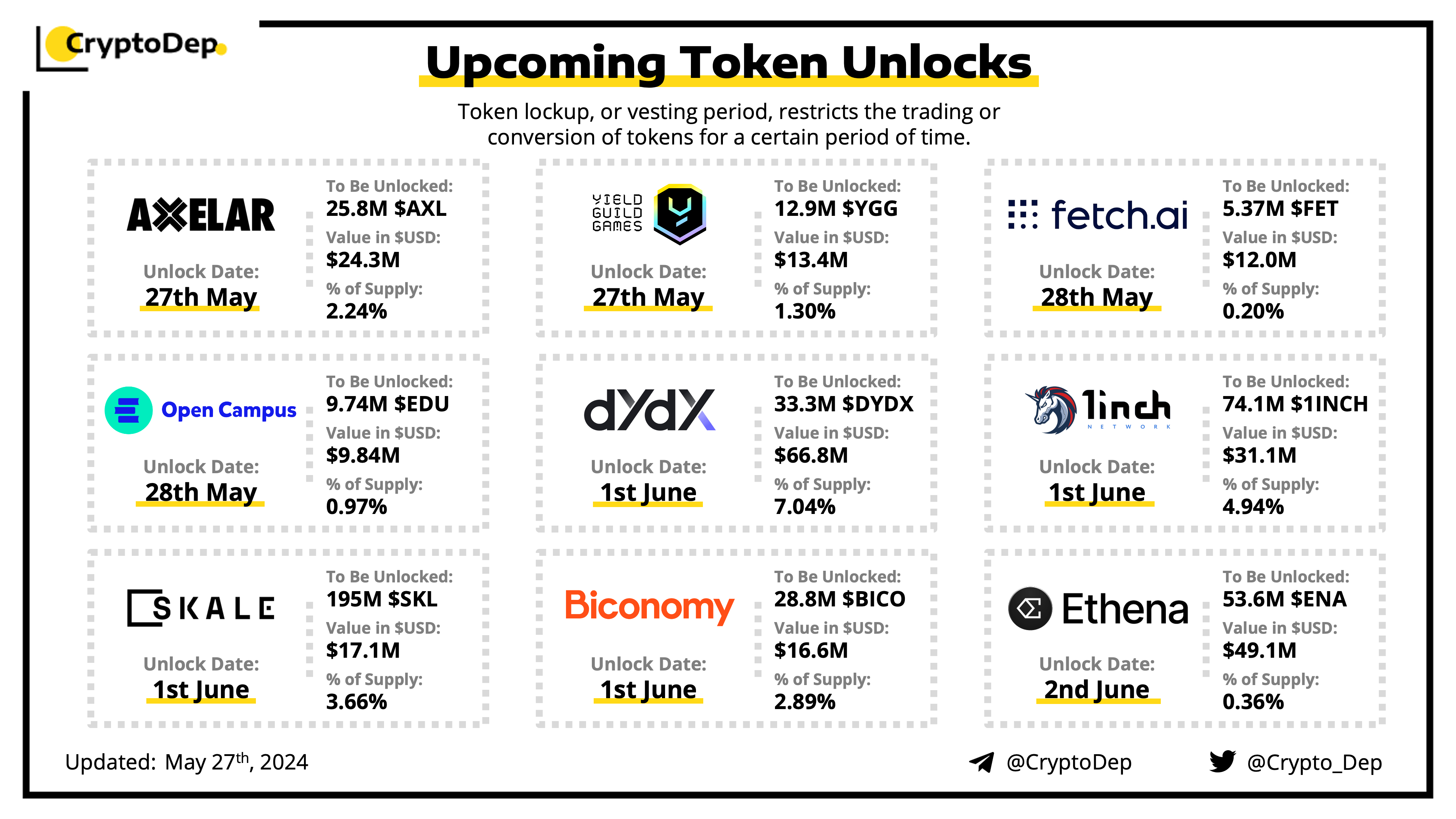 Let's take a look at the compilation of major upcoming token unlocks, diving into details such as dates, amounts, and projects related to tokens that are currently locked up, but will soon be released to the market. During this week, $DYDX, $ENA, $1INCH, $AXL, and $SKL will have the biggest unlocks.